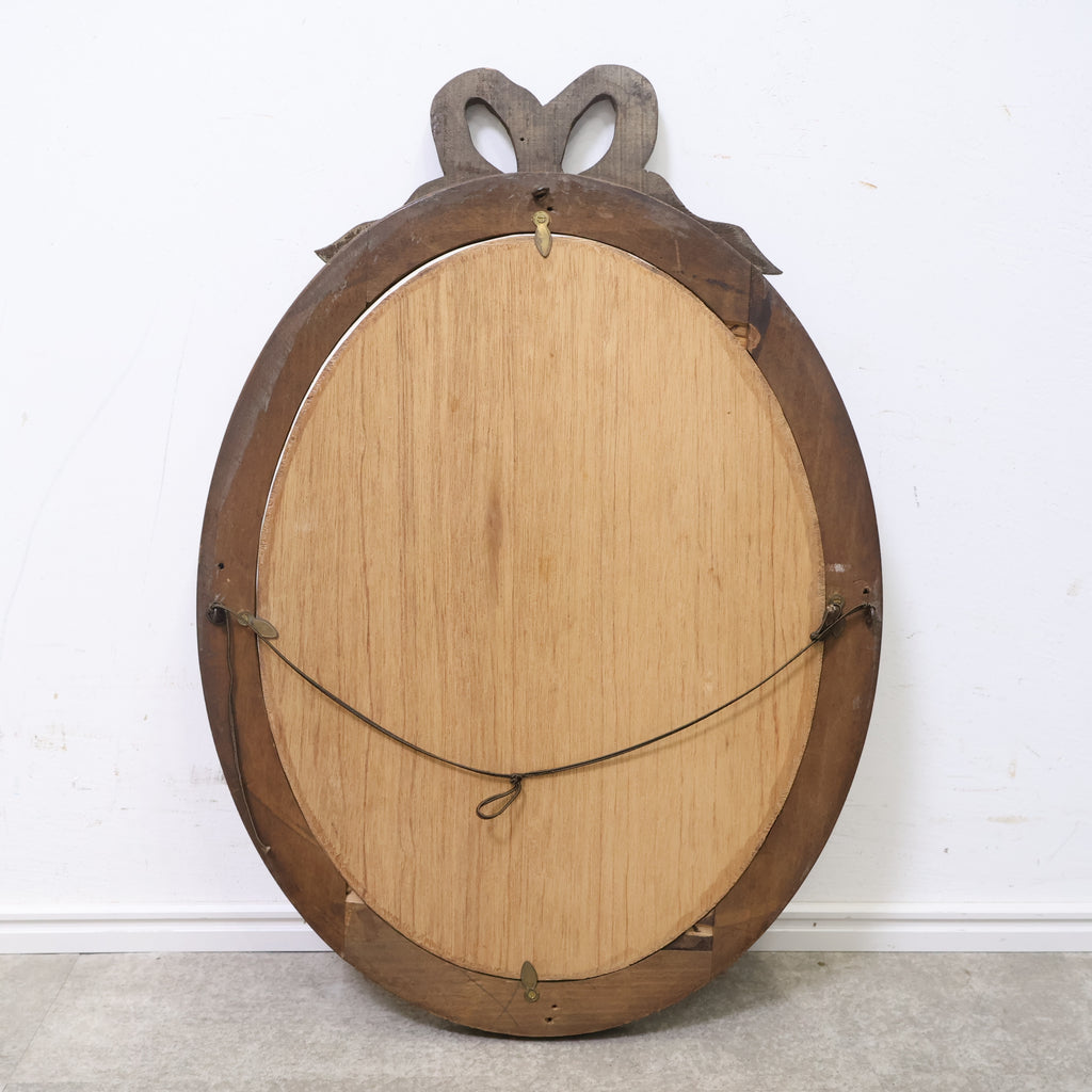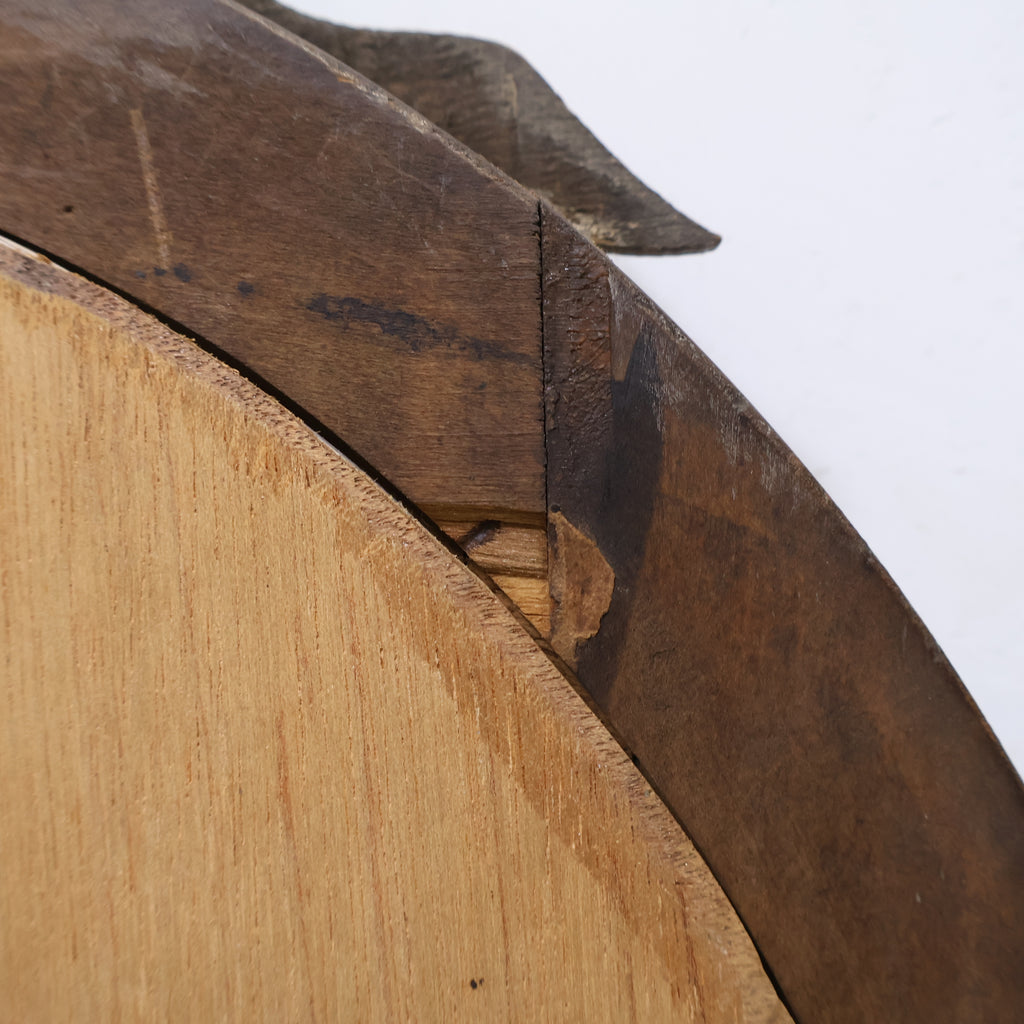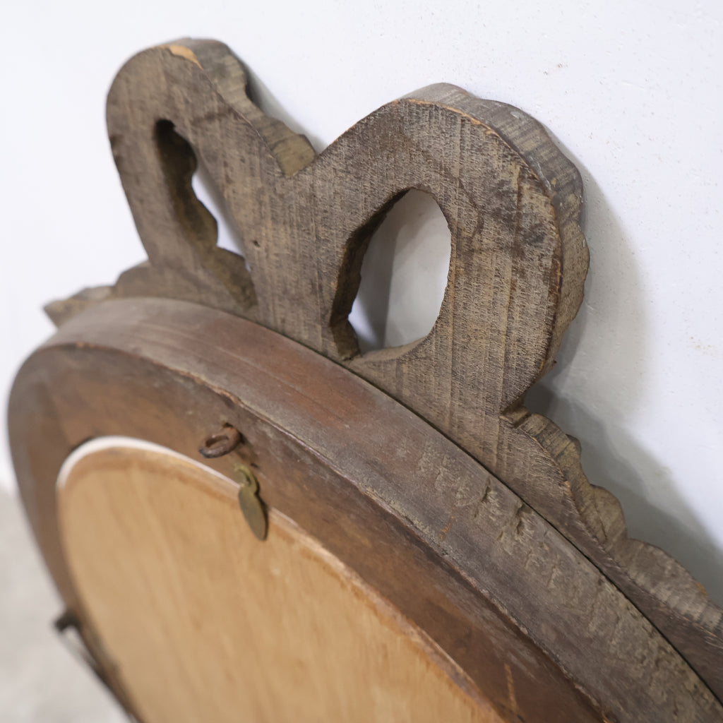 深みのある木の風合いと、繊細な彫刻が組み合わさり、特別な存在感を放っています。楕円形のフォルムは、壁に掛けるだけで空間に柔らかな表情をプラスしてくれますよ。