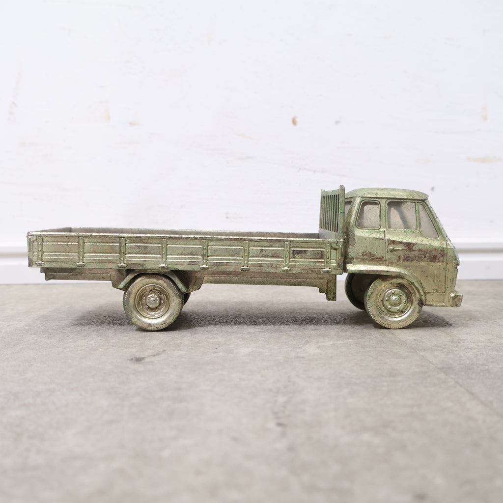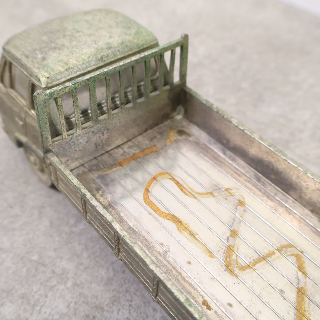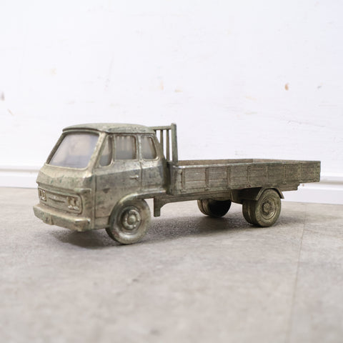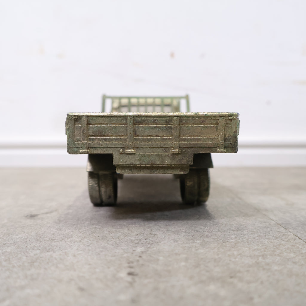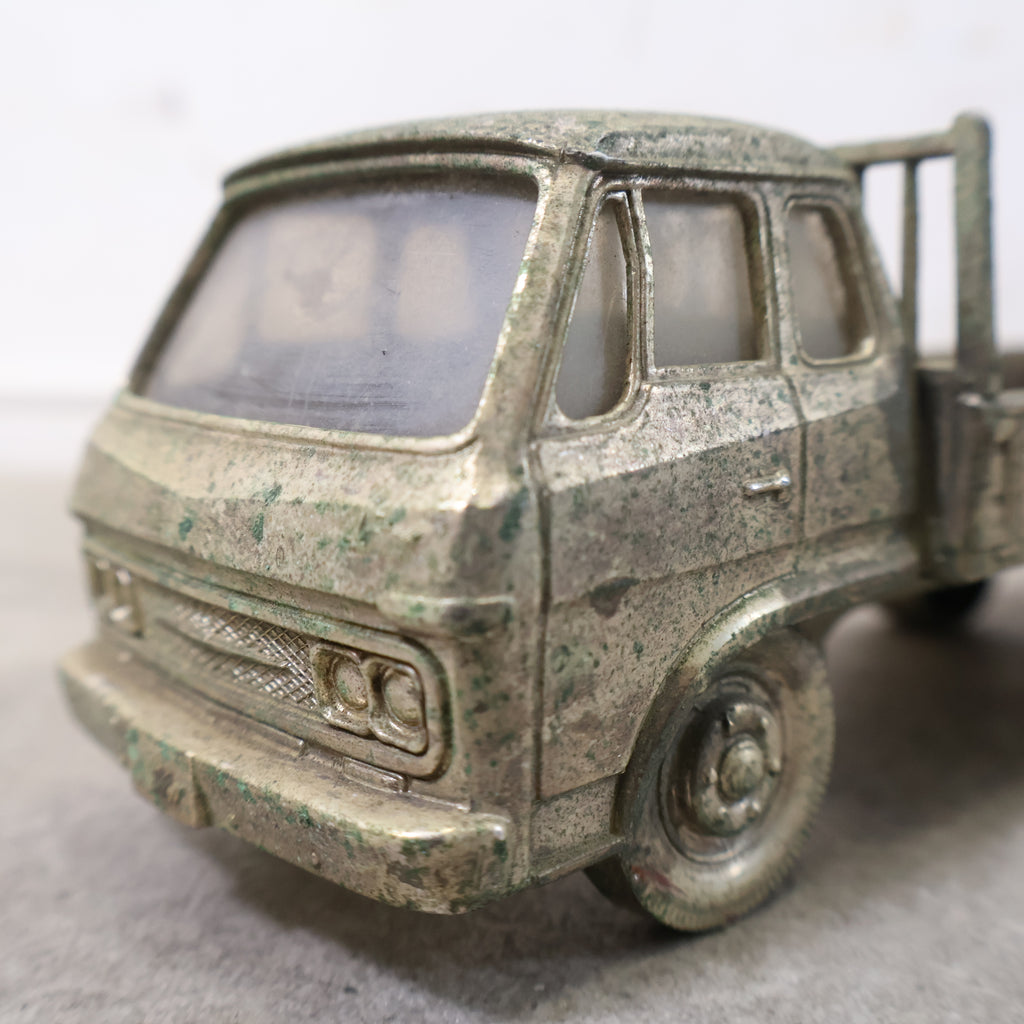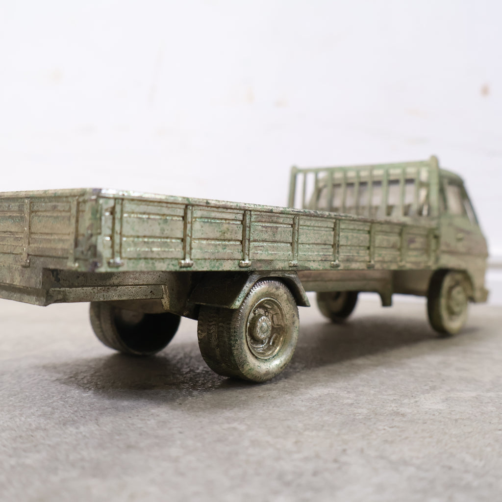 全体を覆うくすんだメタリックな風合いと、長年の使用でついた傷や錆び感が、たまらなくカッコいい一台!荷台がフラットなトラックのデザインも、働く車らしい無骨な魅力があります。小さくても、ずっしりとした重みがあり、確かな存在感を放ちます。