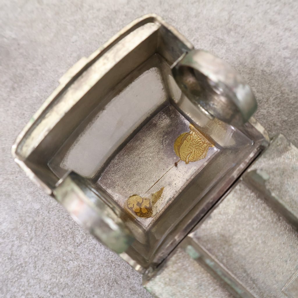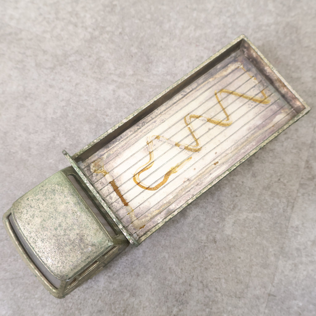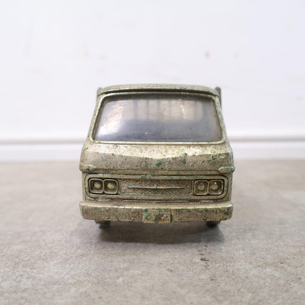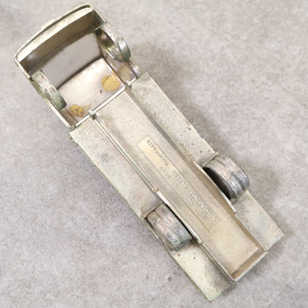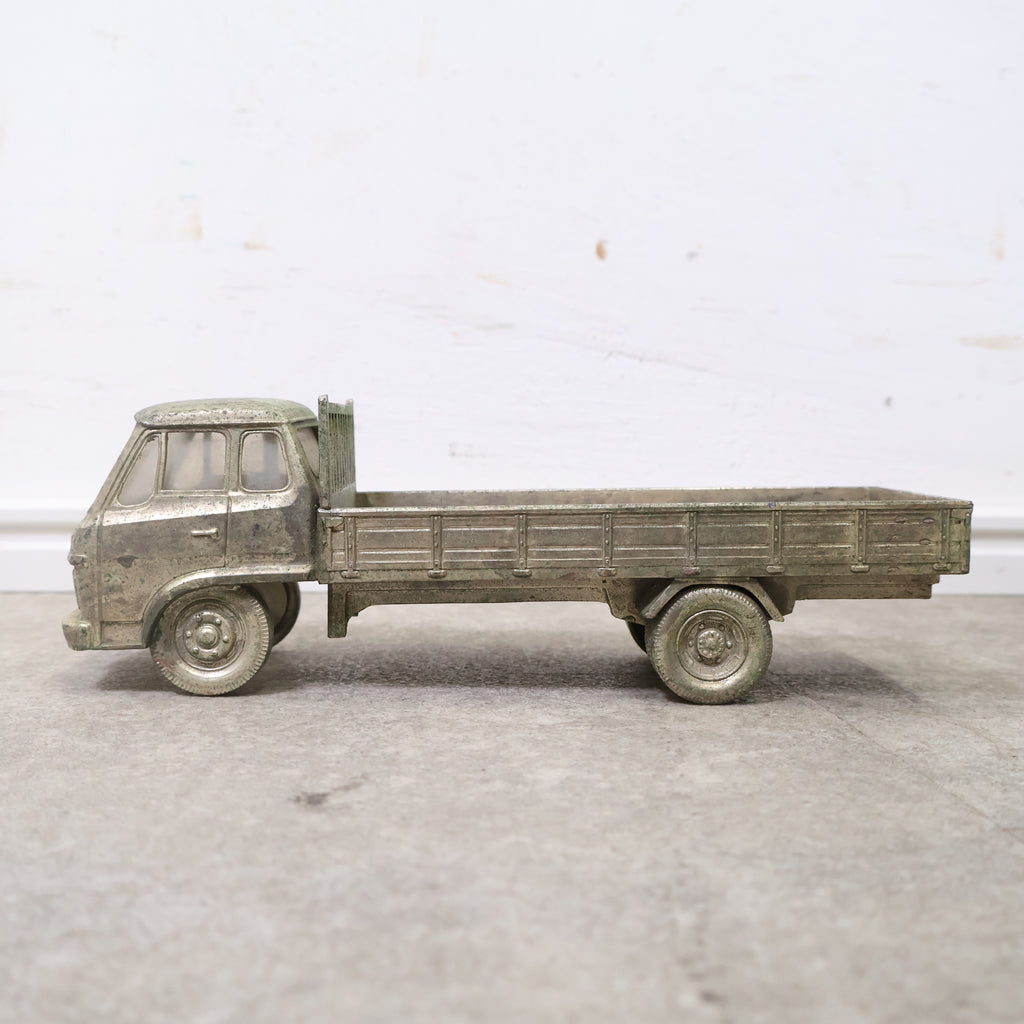 全体を覆うくすんだメタリックな風合いと、長年の使用でついた傷や錆び感が、たまらなくカッコいい一台!荷台がフラットなトラックのデザインも、働く車らしい無骨な魅力があります。小さくても、ずっしりとした重みがあり、確かな存在感を放ちます。