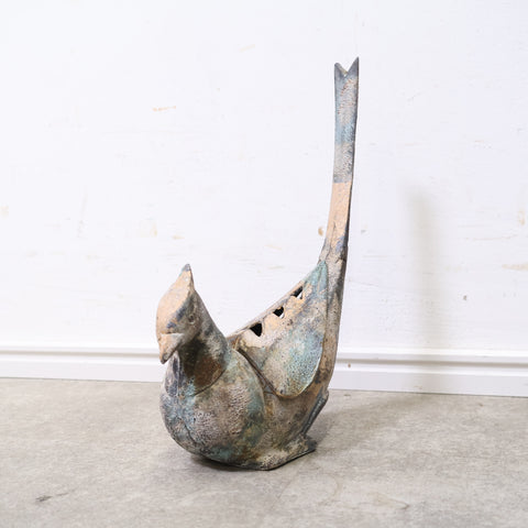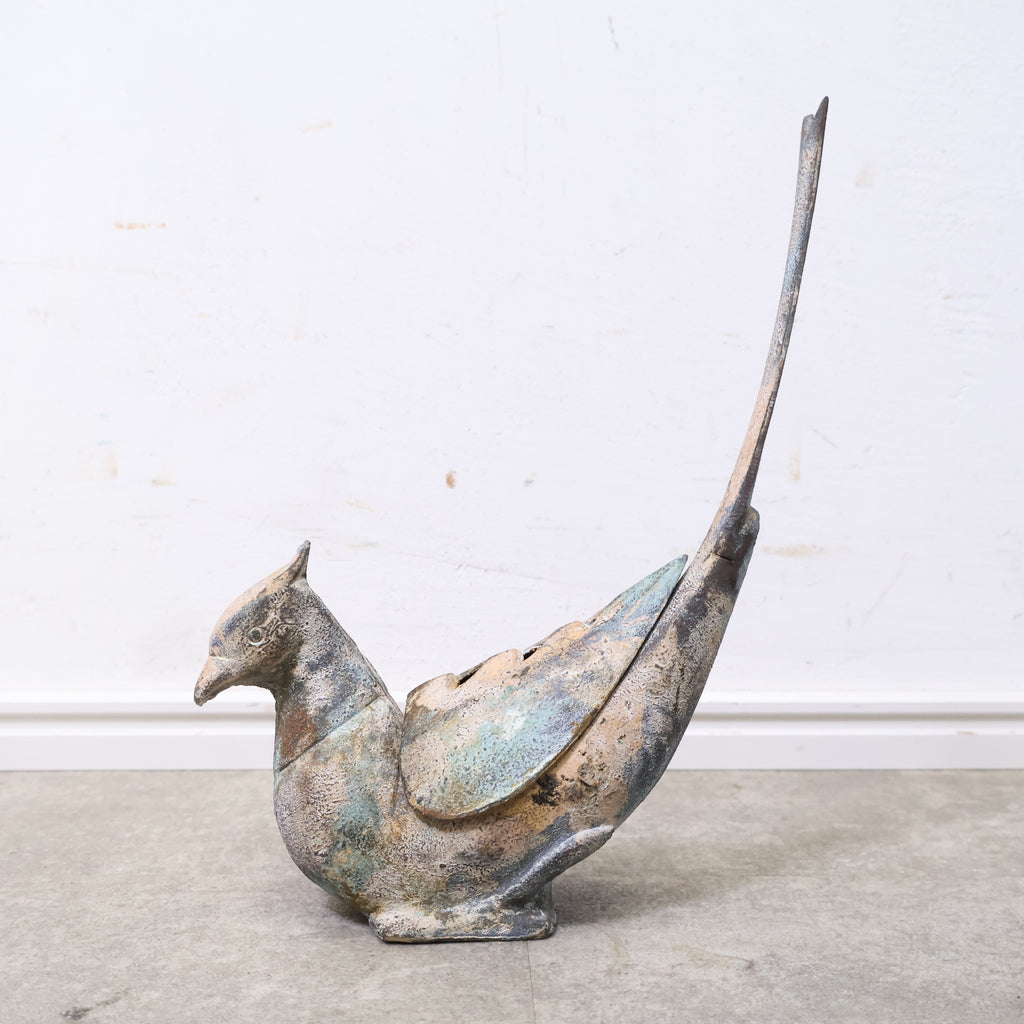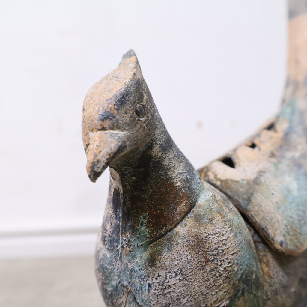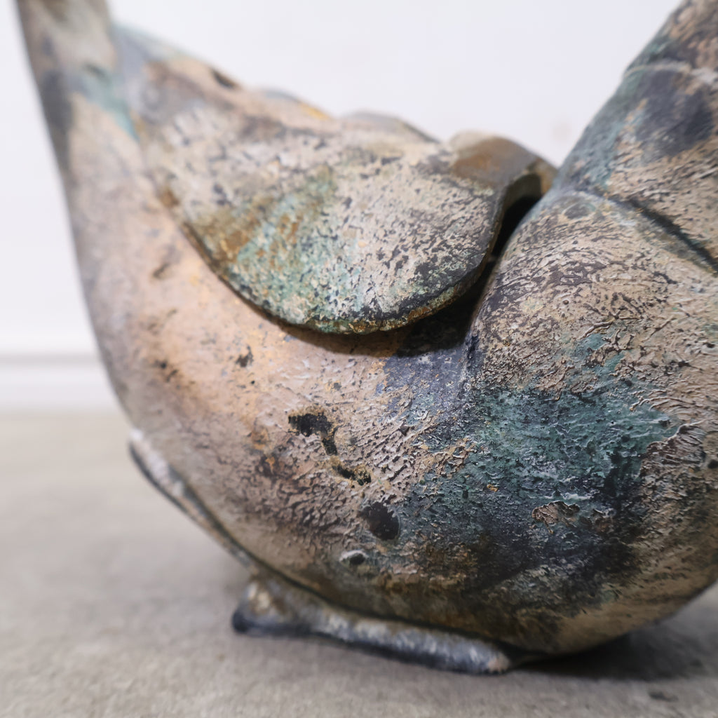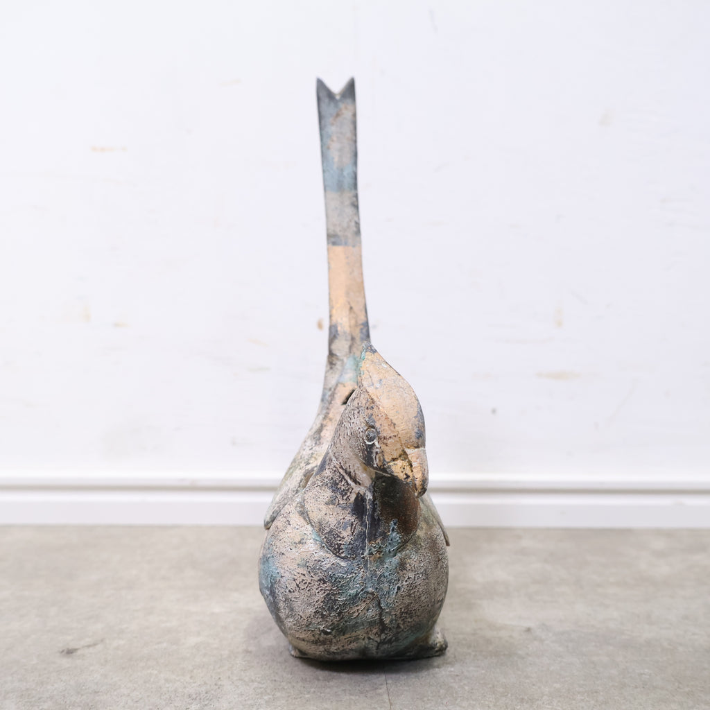青銅のような、錆びてくすんだ色合い(パティナ)が、この鳥に深みと歴史を感じさせます。尾っぽを高く上げた愛らしいフォルムと、体に入ったいくつもの穴(おそらく香炉やアロマポットとしての機能)が、遊び心をくすぐります。