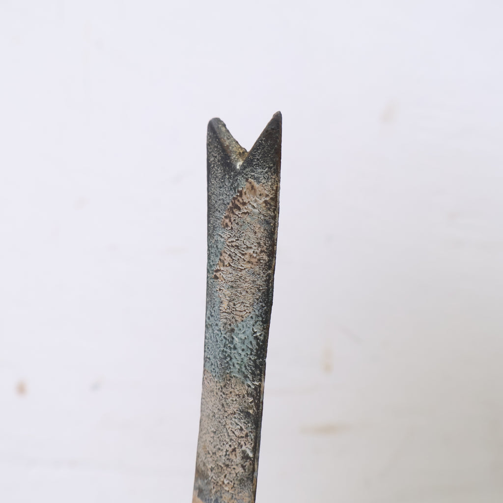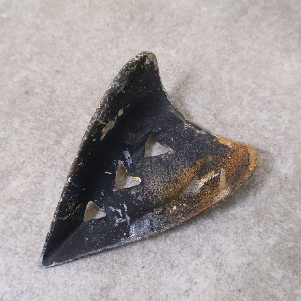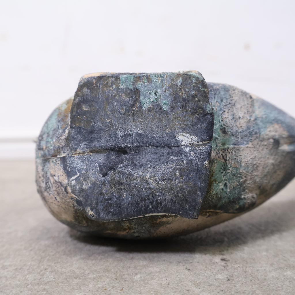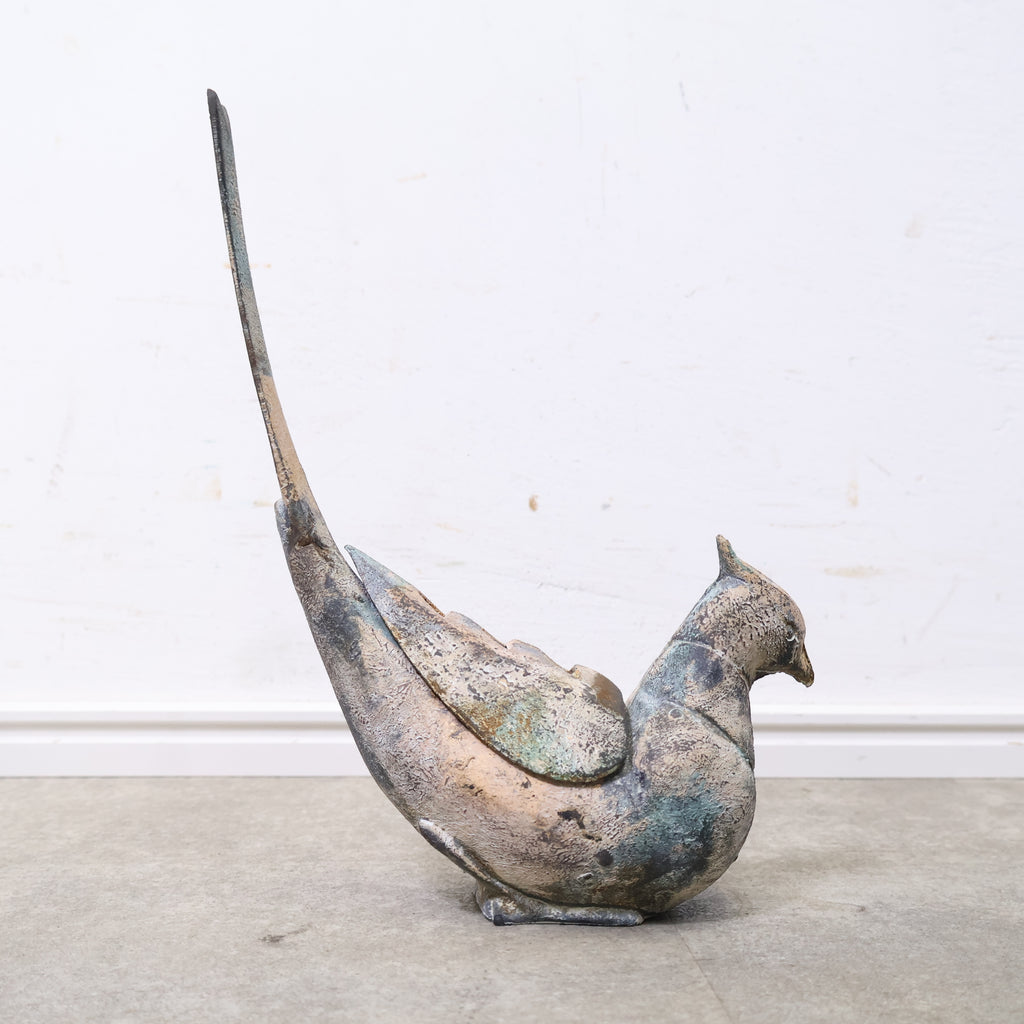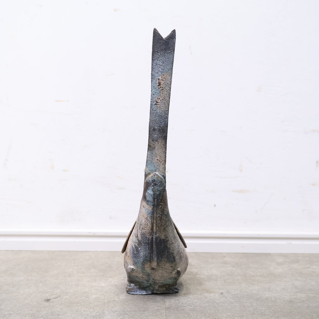 青銅のような、錆びてくすんだ色合い(パティナ)が、この鳥に深みと歴史を感じさせます。尾っぽを高く上げた愛らしいフォルムと、体に入ったいくつもの穴(おそらく香炉やアロマポットとしての機能)が、遊び心をくすぐります。