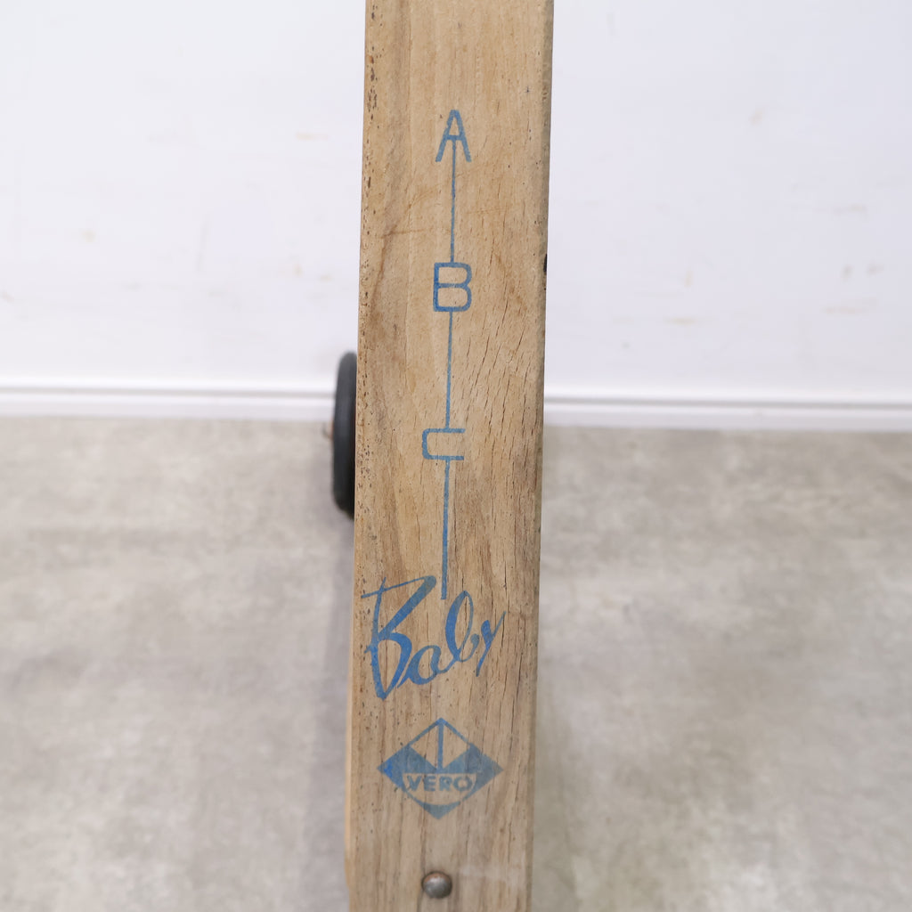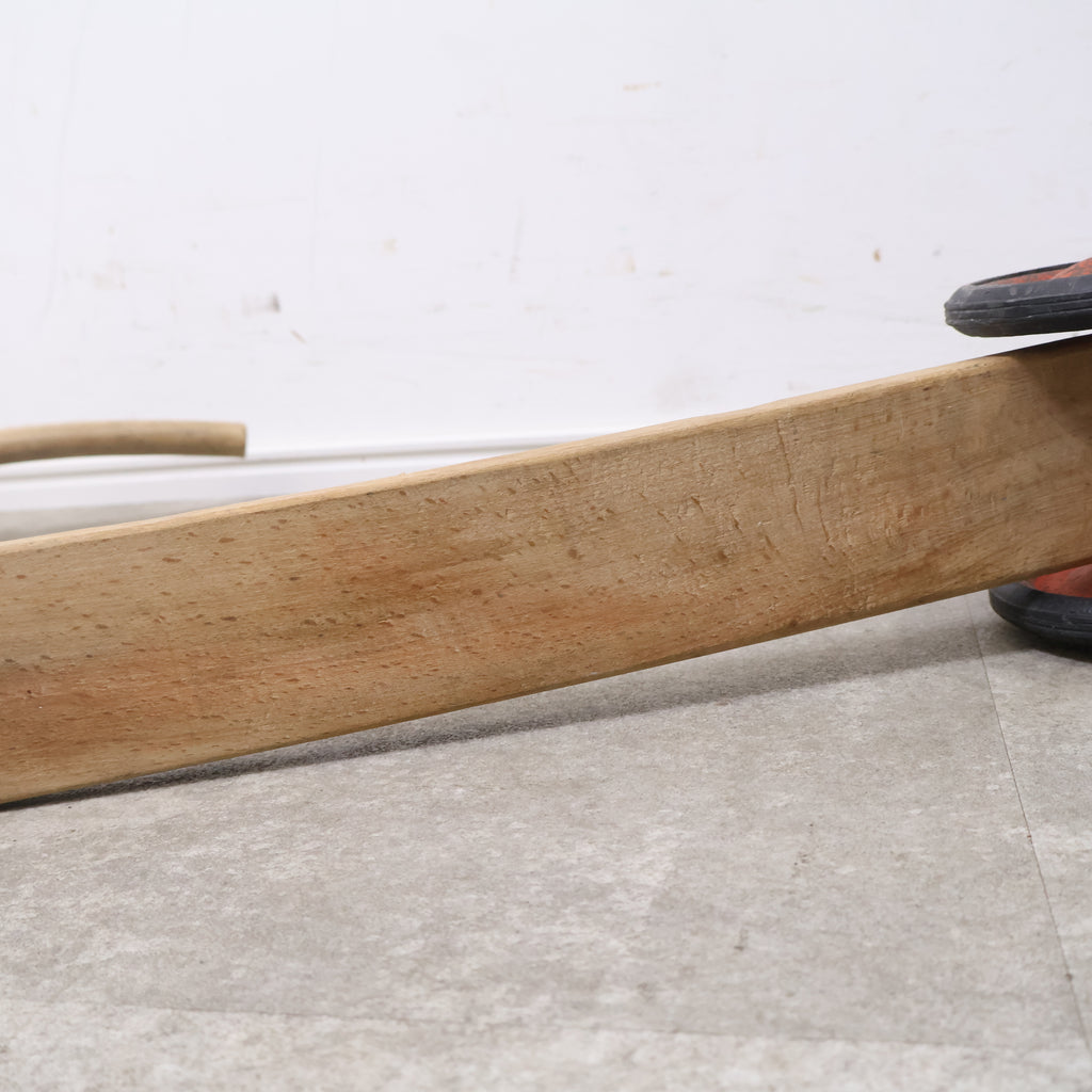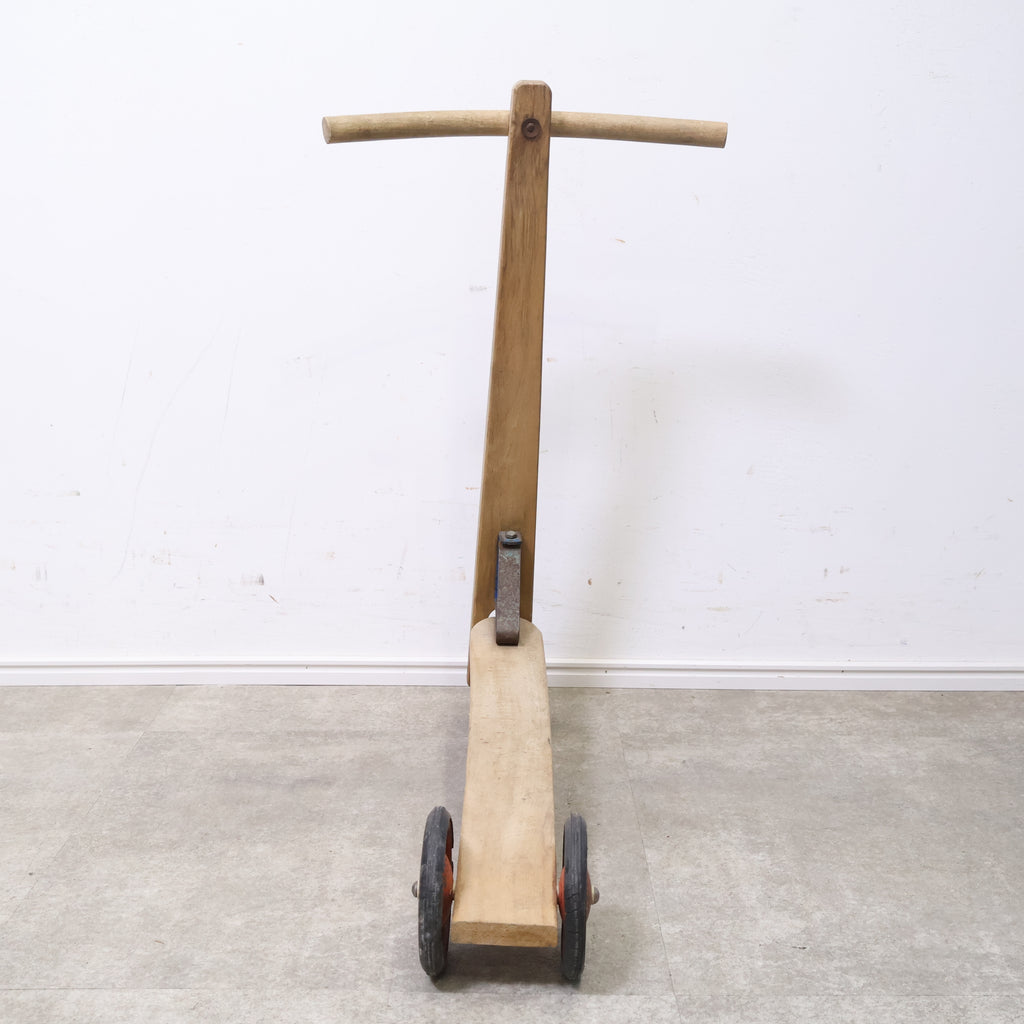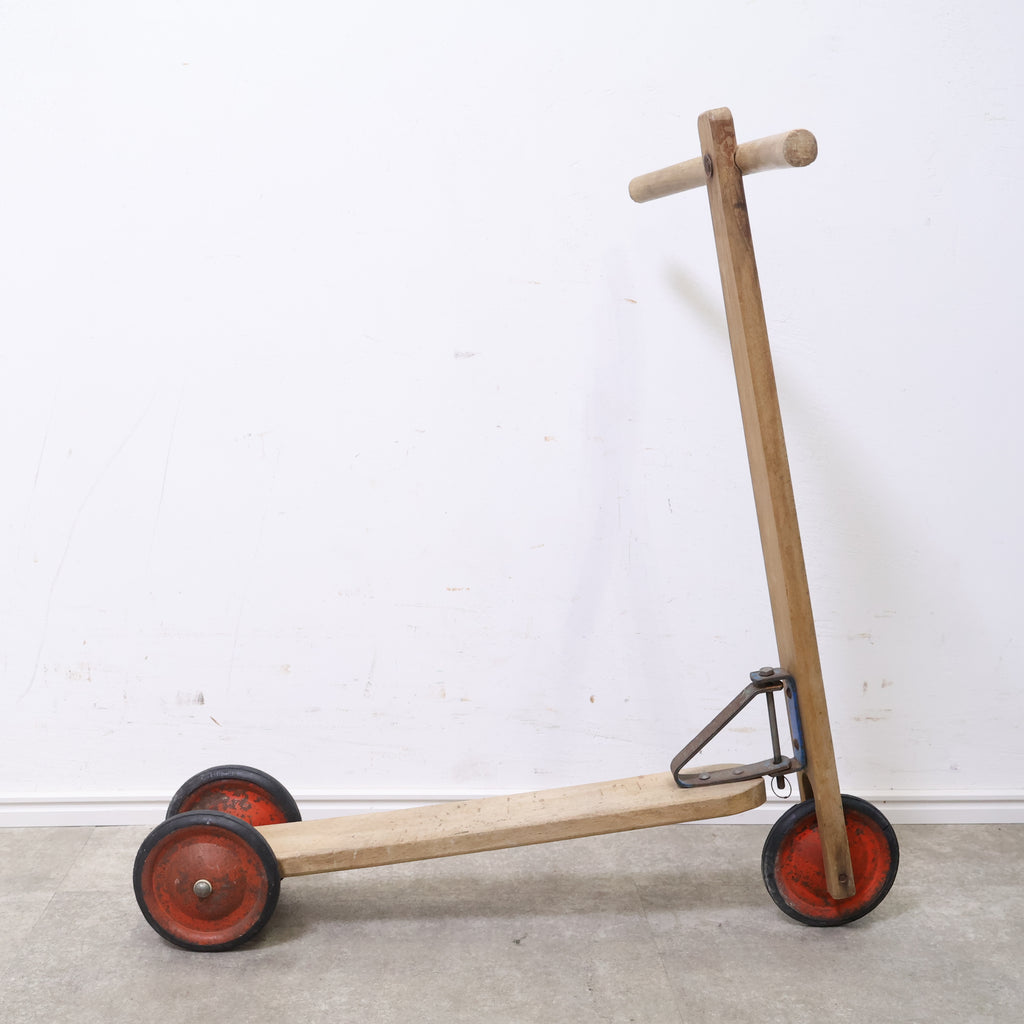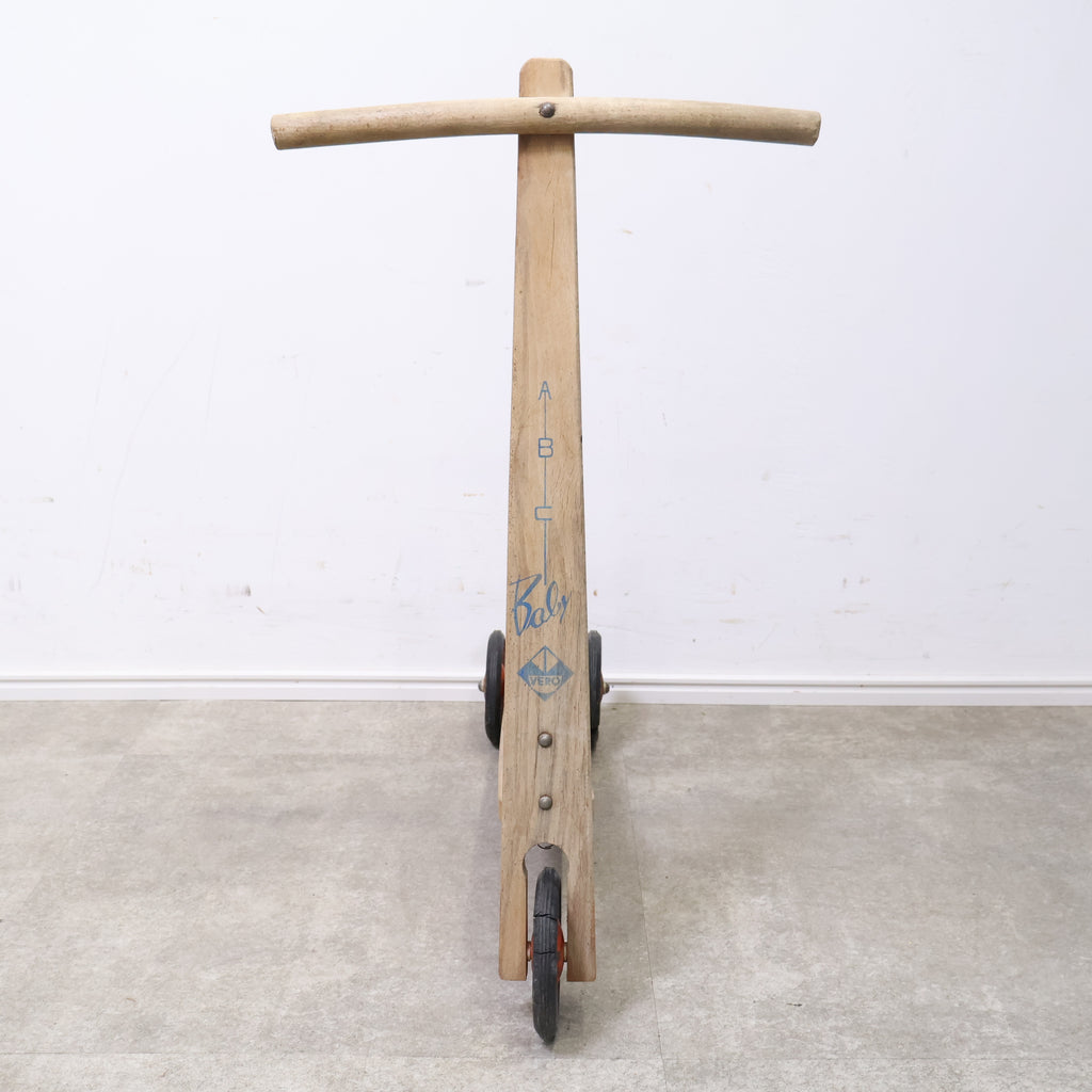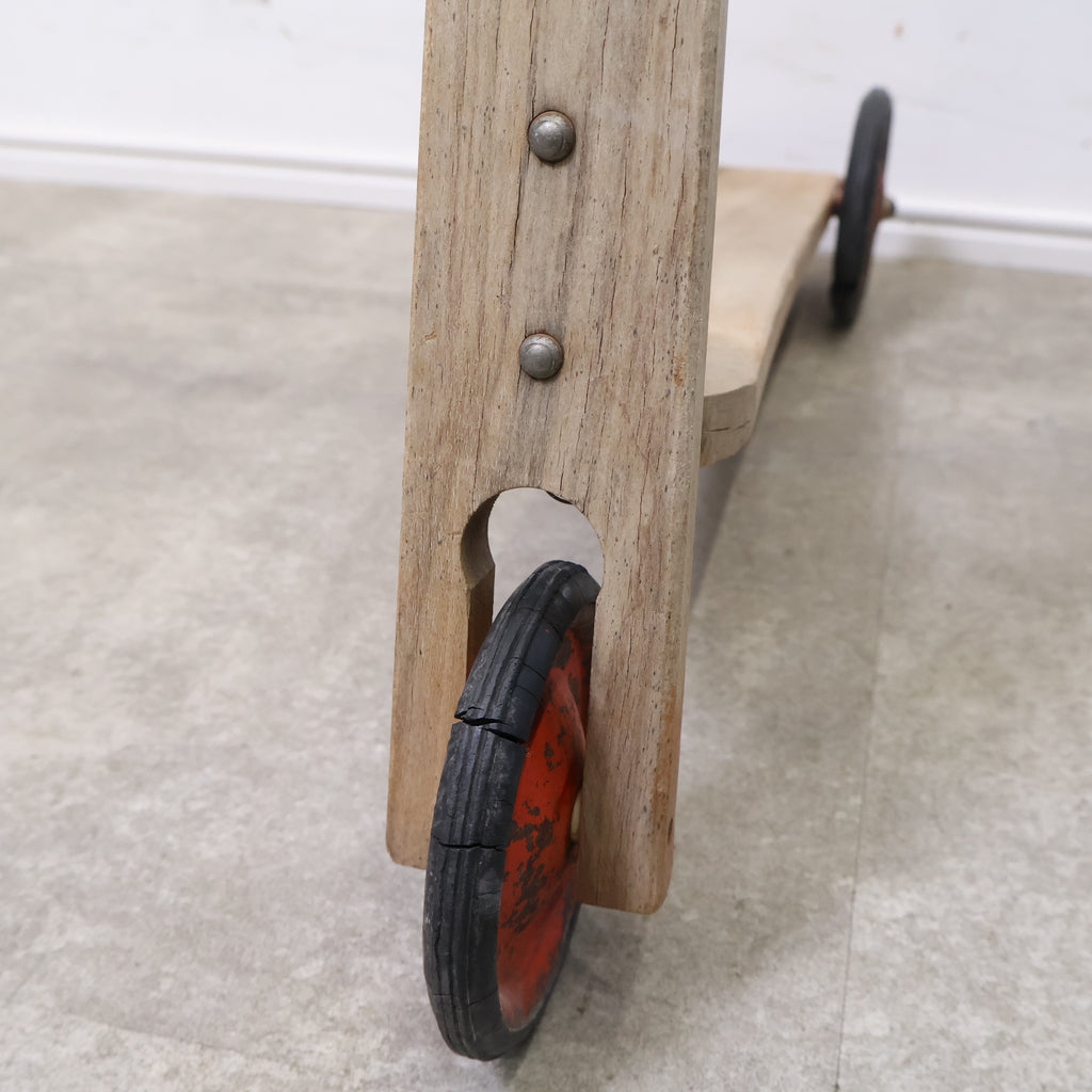 。 シンプルな木の板と、赤く錆びた車輪のコントラストが、たまらなくノスタルジック!ハンドルや「Baby ABC」のロゴ(推定)から、長い年月、大切に使われてきた歴史が伝わってきます。電動スクーターにはない、木の温もりを感じるアナログな魅力が詰まっています。 キッズルームやリビングの片隅に立てかけるだけで、お部屋が一気にレトロな遊び心ある空間に!