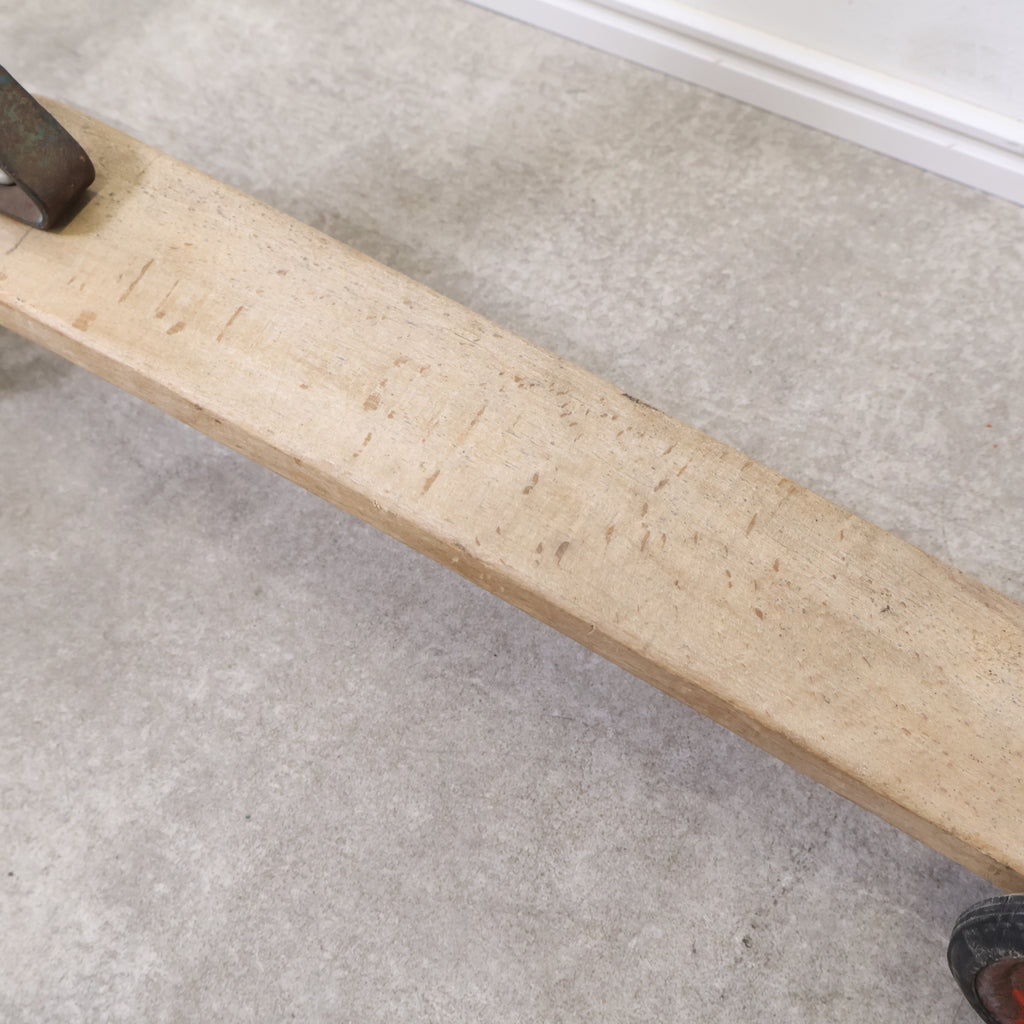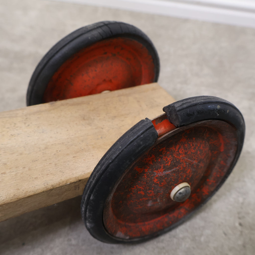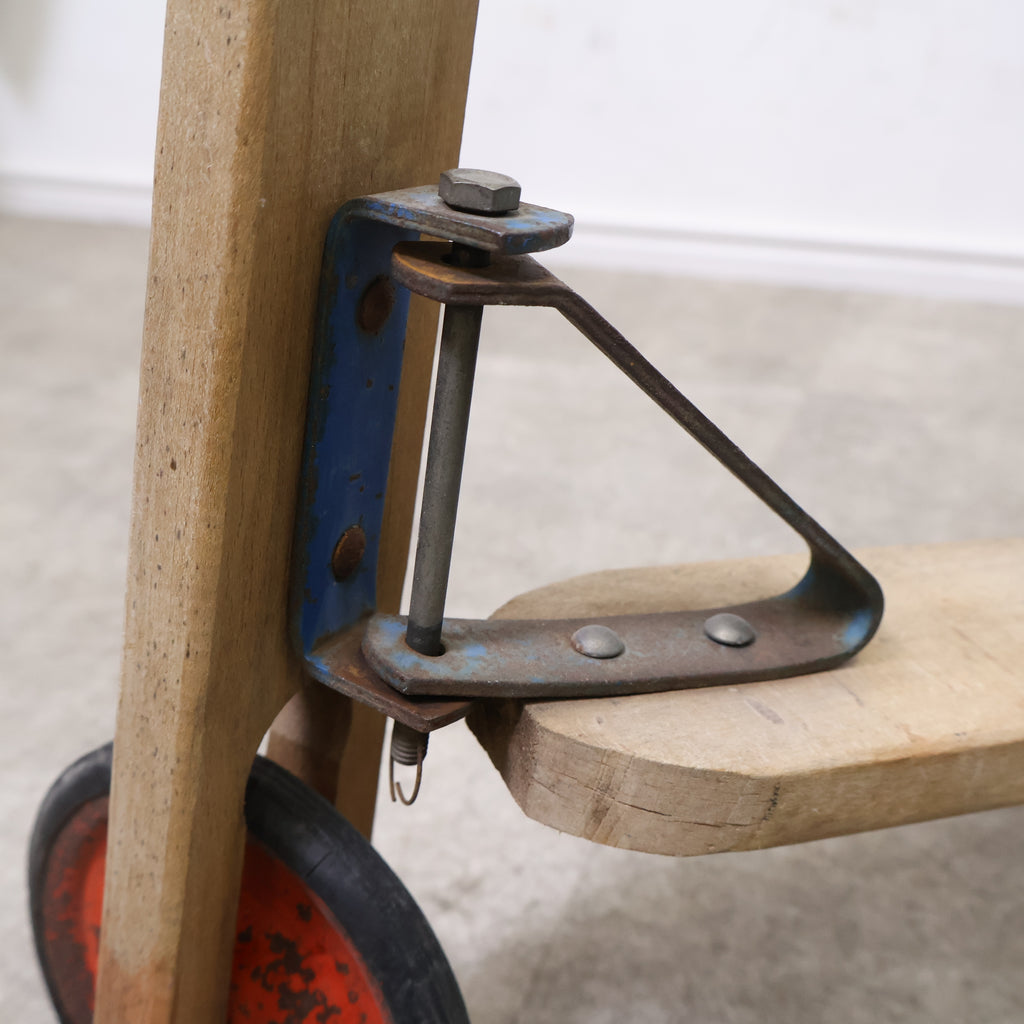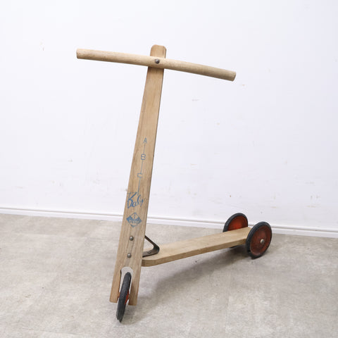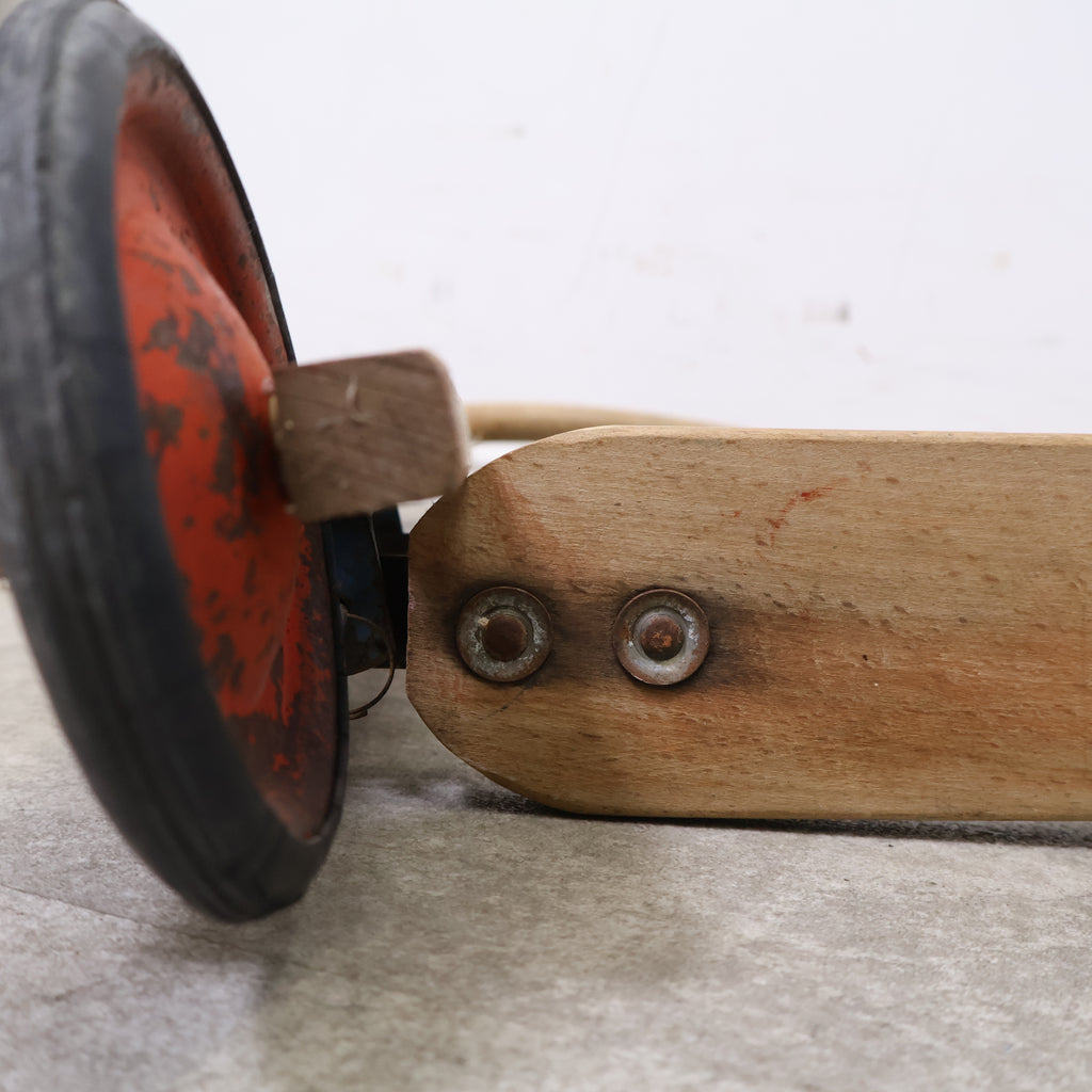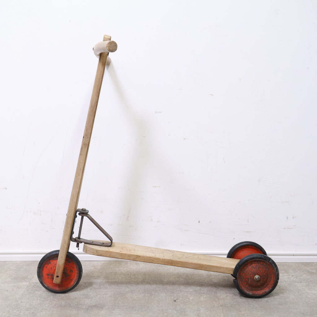 。 シンプルな木の板と、赤く錆びた車輪のコントラストが、たまらなくノスタルジック!ハンドルや「Baby ABC」のロゴ(推定)から、長い年月、大切に使われてきた歴史が伝わってきます。電動スクーターにはない、木の温もりを感じるアナログな魅力が詰まっています。 キッズルームやリビングの片隅に立てかけるだけで、お部屋が一気にレトロな遊び心ある空間に!