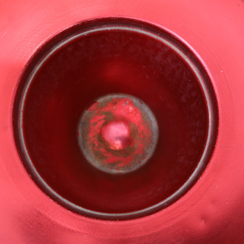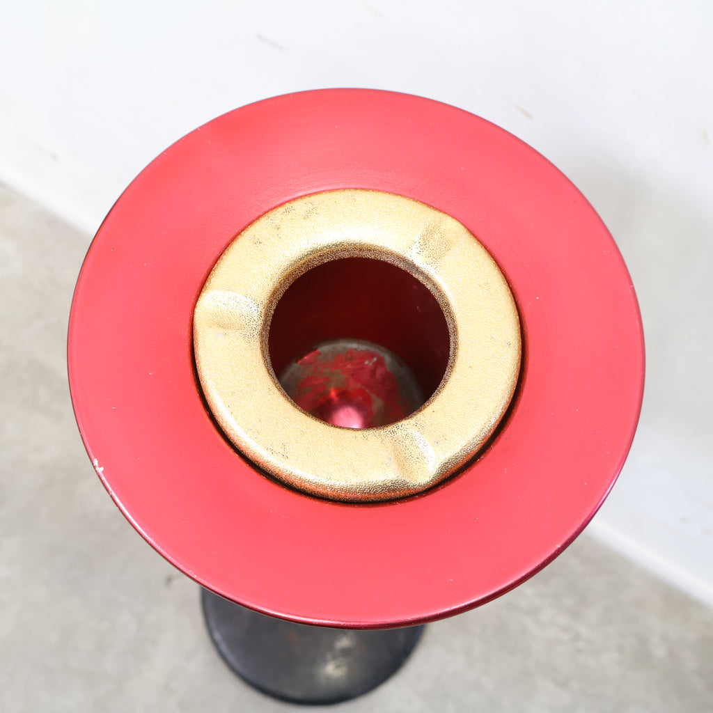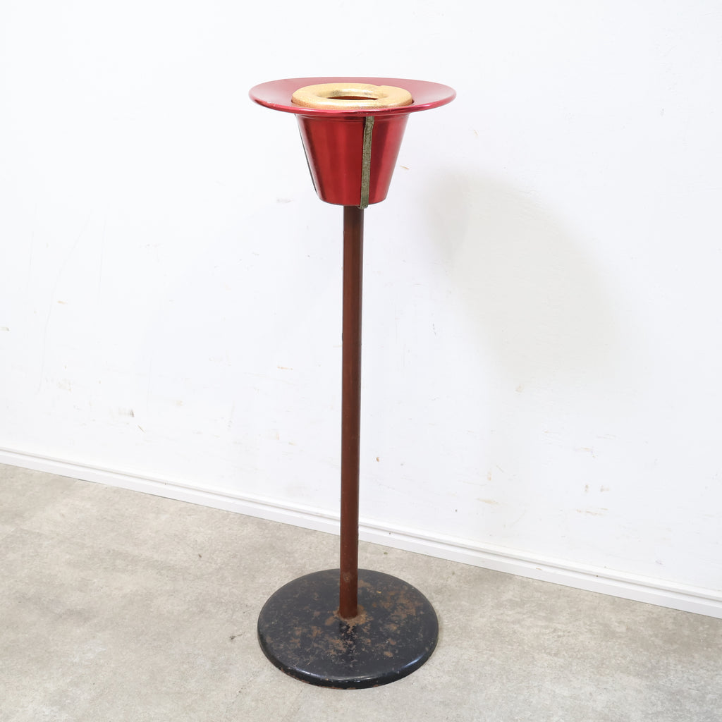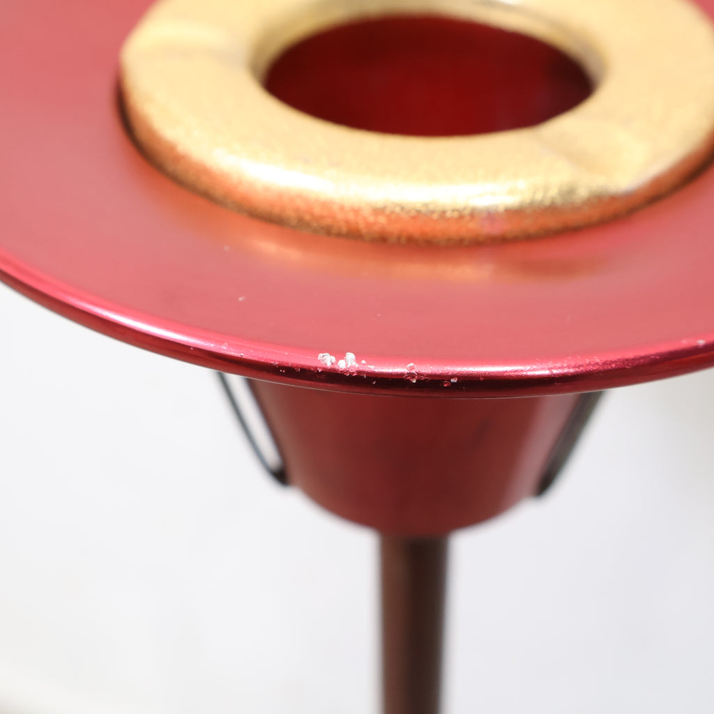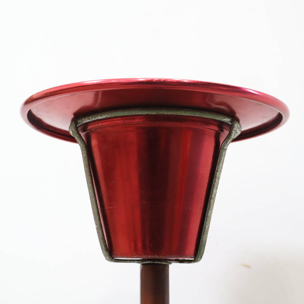 上部のボウルは鮮やかなレッドの円錐形で、帽子のようなユニークなフォルムが特徴的です。細身のポールと、重量感のあるブラックの円形台座が全体のバランスを取っています。このシンプルかつレトロなデザインが、空間にノスタルジックでモダンなアクセントを加えます。