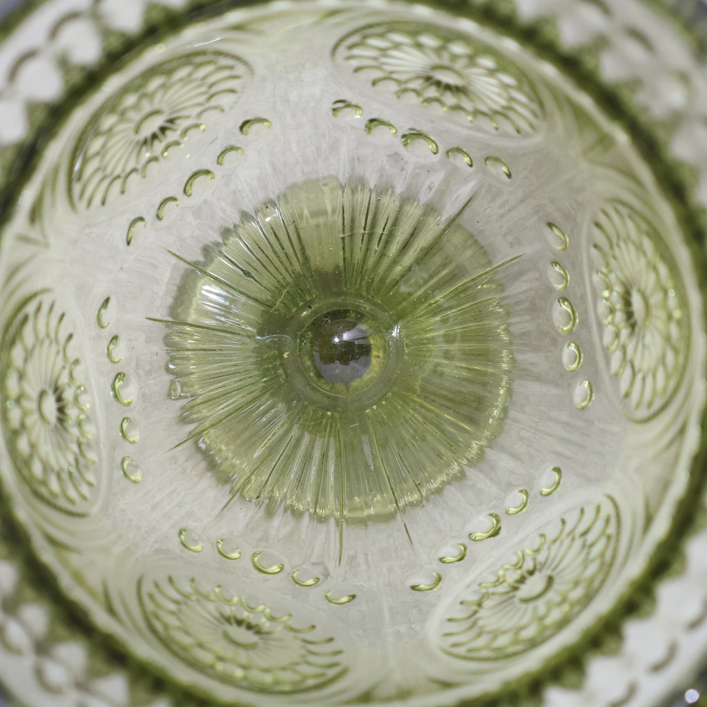 目立つ傷や欠けのない極美品で、実用と観賞の両方でお楽しみいただけます。ノスタルジックなムードを演出する希少なプレスガラス食器です。