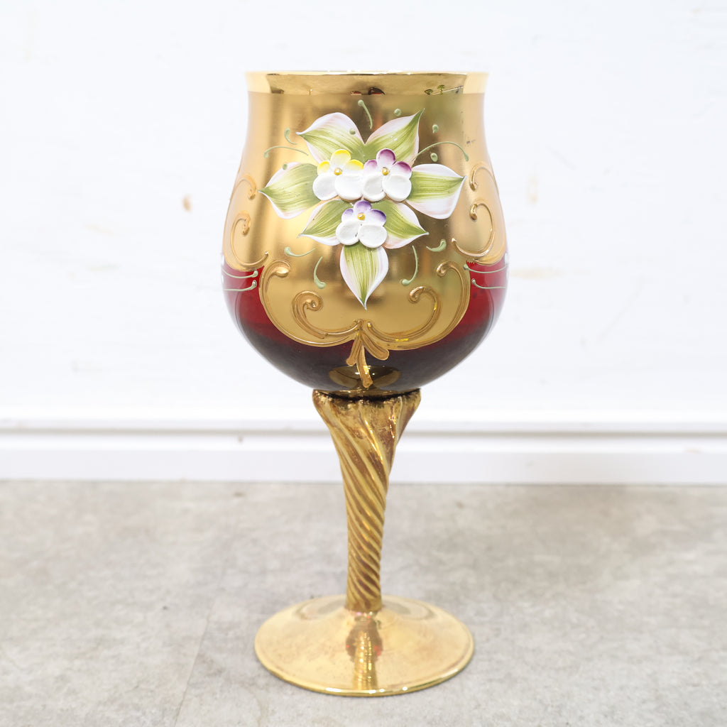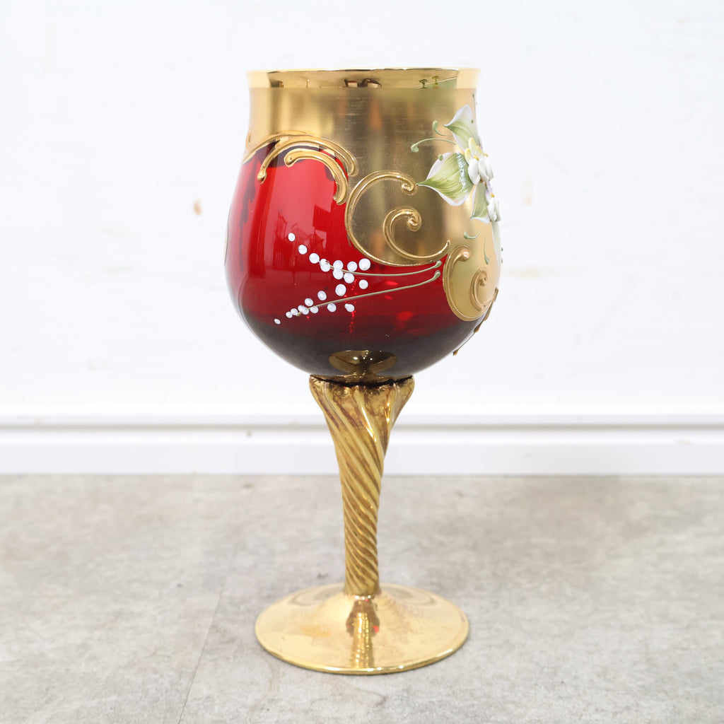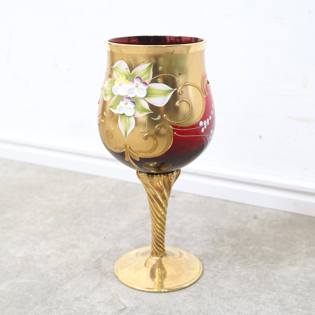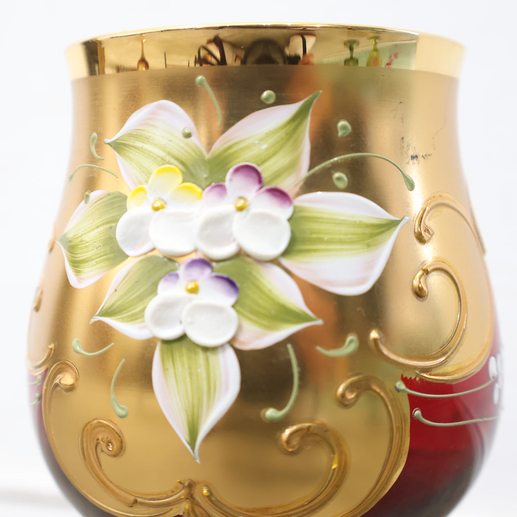 ボウル全体には、贅沢な金彩(ゴールドペイント)と、立体的な白・緑のエナメル彩で花柄装飾が施されています。下層のルビーレッドのガラスが相まって、比類ない豪華さと優雅さを放ちます。ステム(脚)は、ツイストしたような造形の**ゴールドメタル(真鍮/ブラス)**で、非常に重厚な作りです。