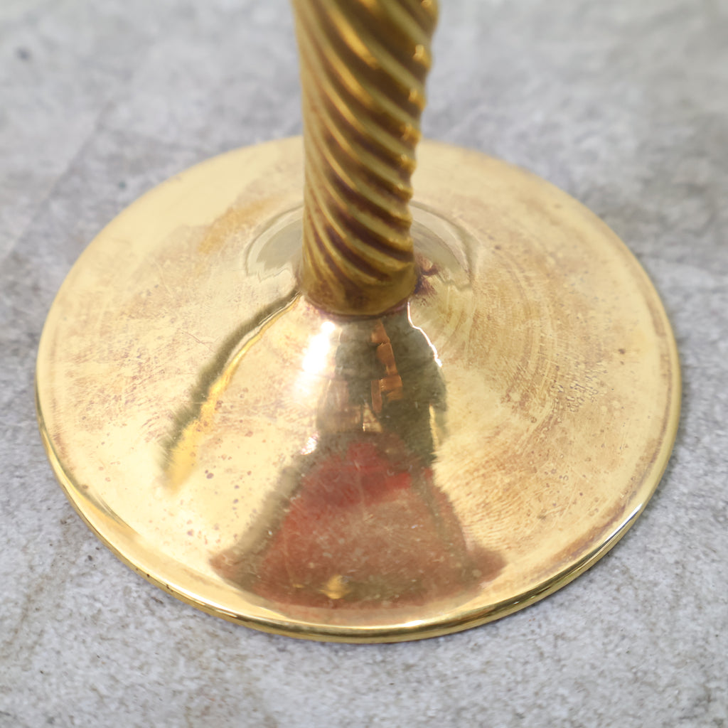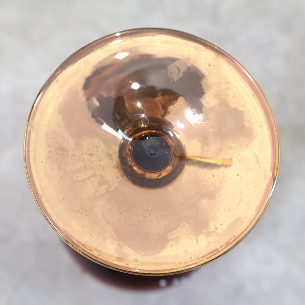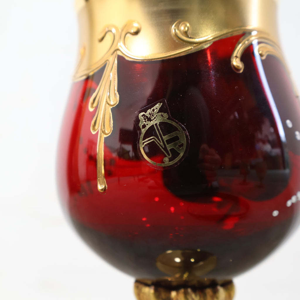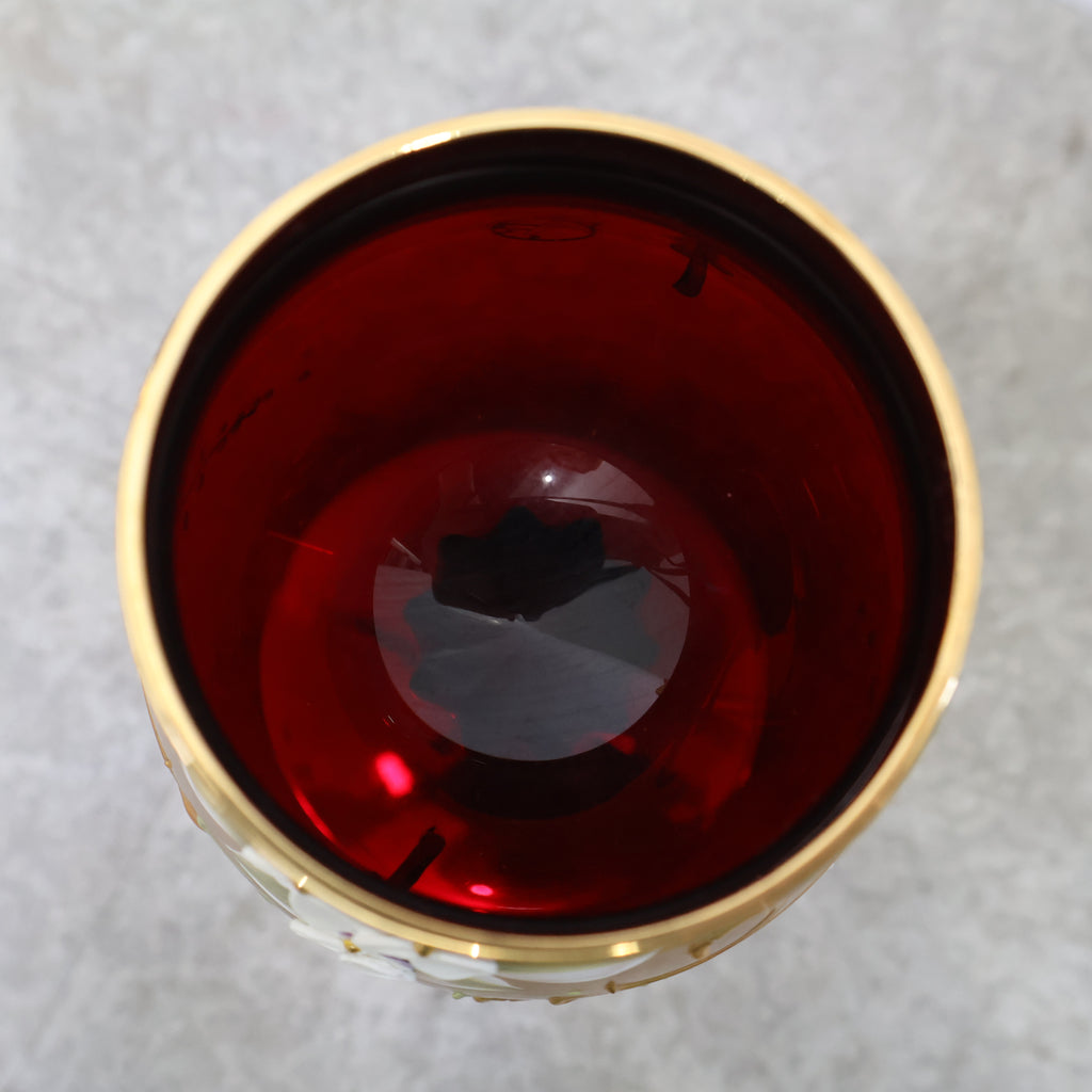 ボウル全体には、贅沢な金彩(ゴールドペイント)と、立体的な白・緑のエナメル彩で花柄装飾が施されています。下層のルビーレッドのガラスが相まって、比類ない豪華さと優雅さを放ちます。ステム(脚)は、ツイストしたような造形の**ゴールドメタル(真鍮/ブラス)**で、非常に重厚な作りです。