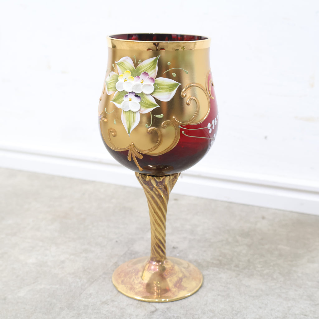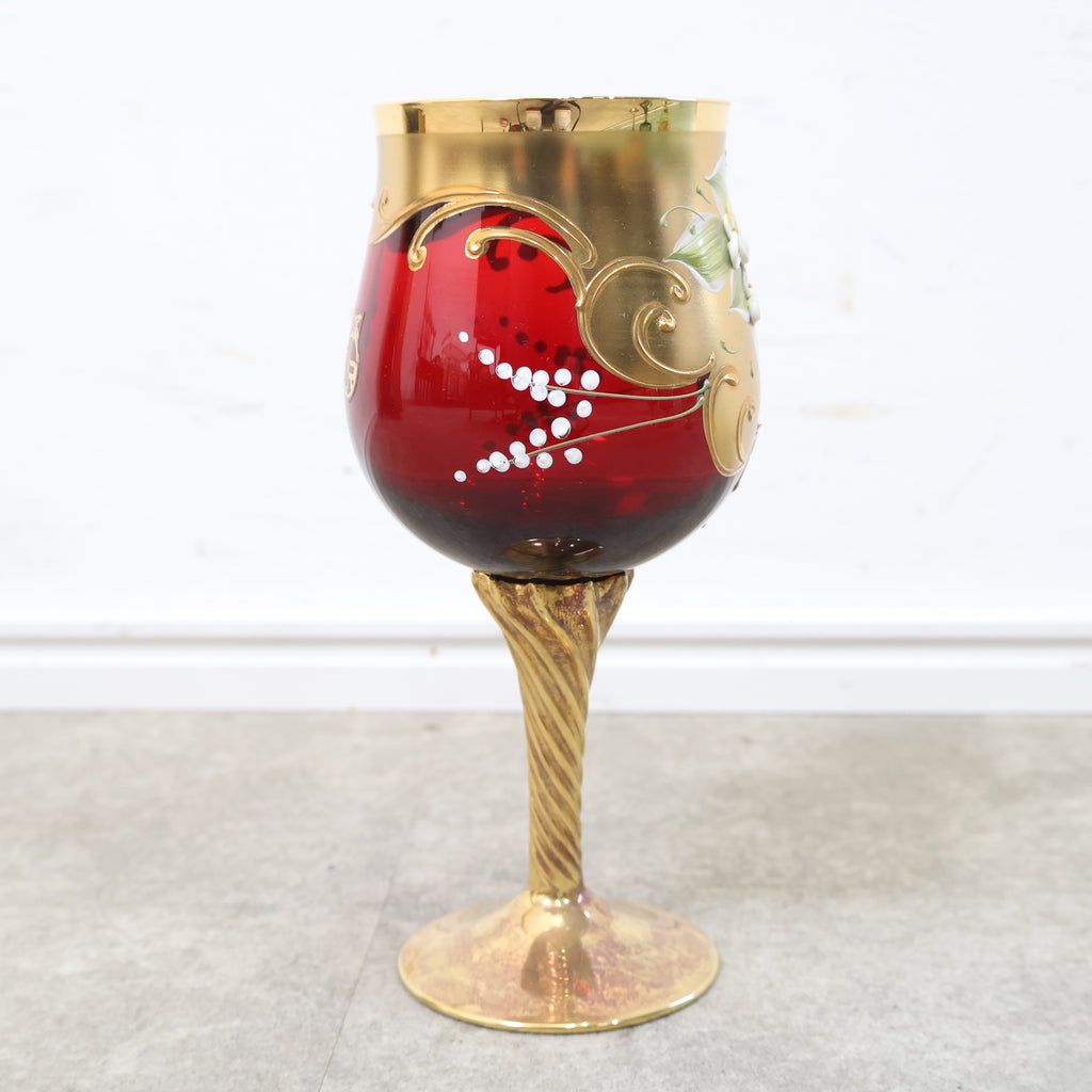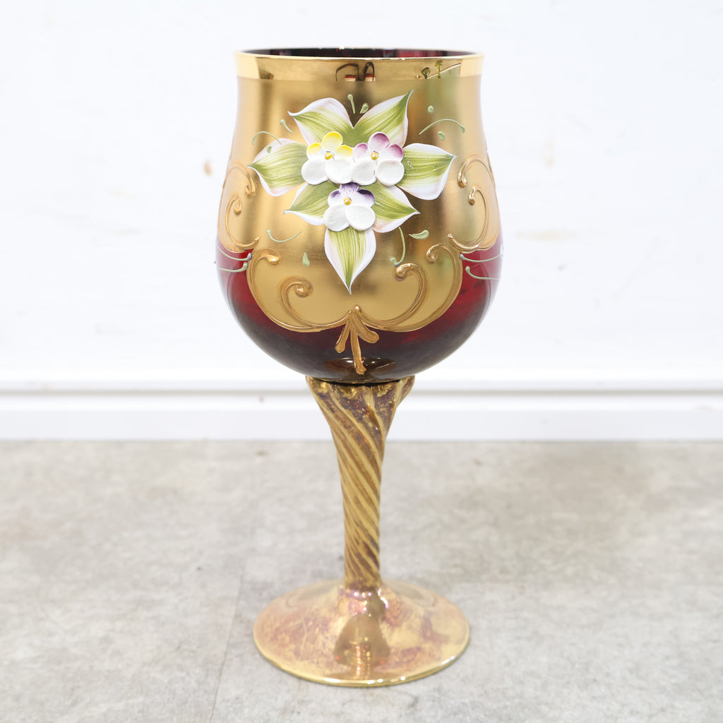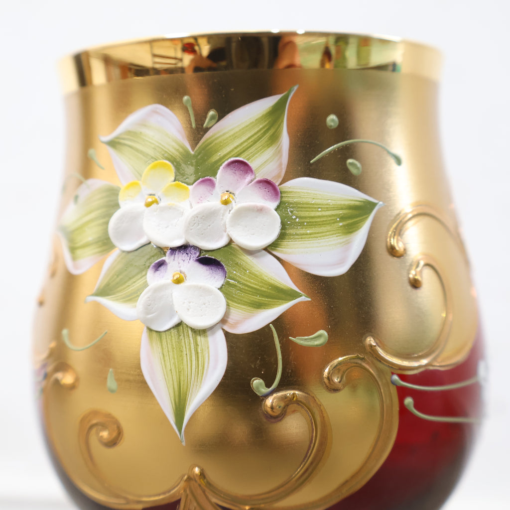ボウル全体には、贅沢な金彩(ゴールドペイント)と、立体的な白・緑のエナメル彩で花柄装飾が施されています。下層のルビーレッドのガラスが相まって、比類ない豪華さと優雅さを放ちます。ステム(脚)は、ツイストしたような造形の**ゴールドメタル(真鍮/ブラス)**で、非常に重厚な作りです。