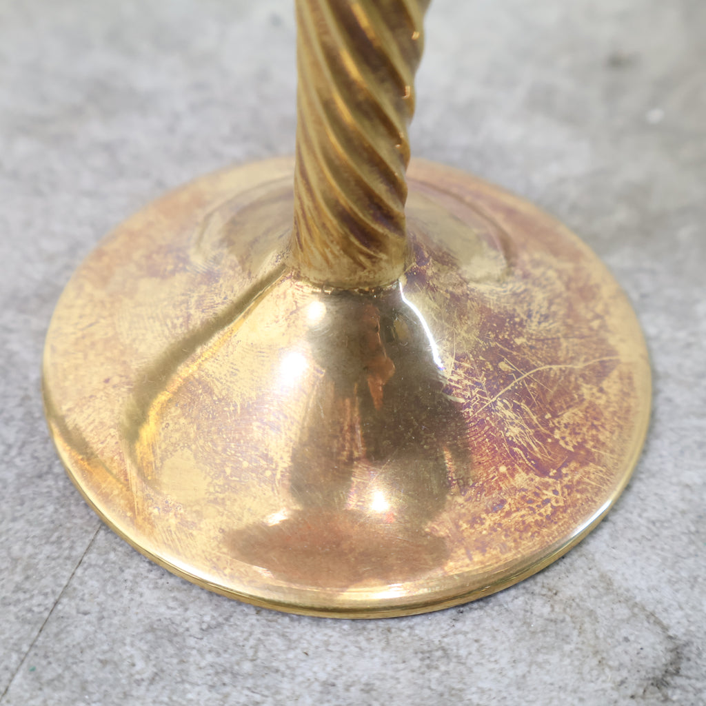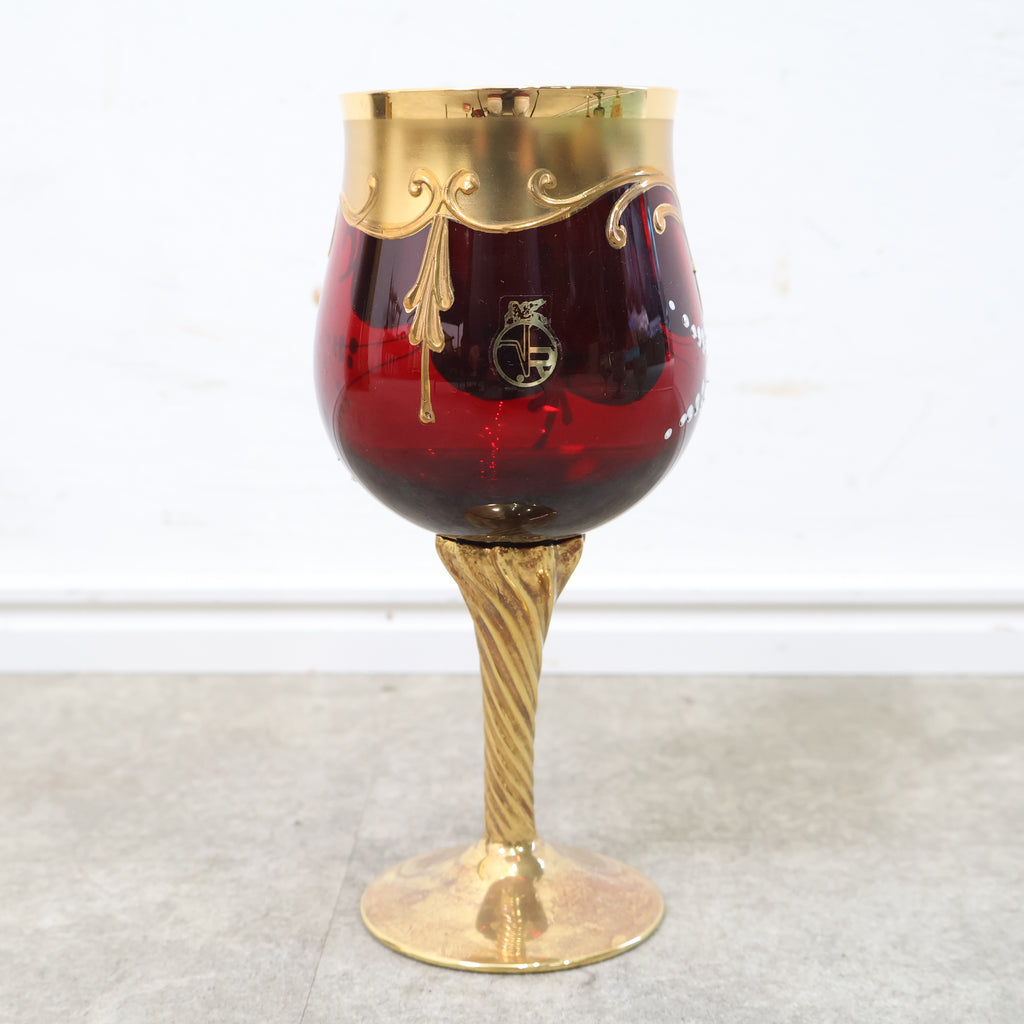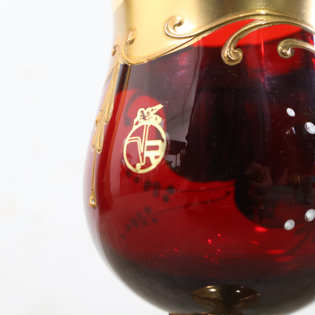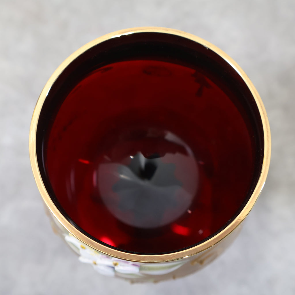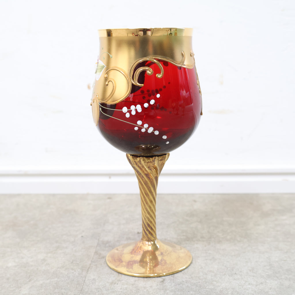 ボウル全体には、贅沢な金彩(ゴールドペイント)と、立体的な白・緑のエナメル彩で花柄装飾が施されています。下層のルビーレッドのガラスが相まって、比類ない豪華さと優雅さを放ちます。ステム(脚)は、ツイストしたような造形の**ゴールドメタル(真鍮/ブラス)**で、非常に重厚な作りです。