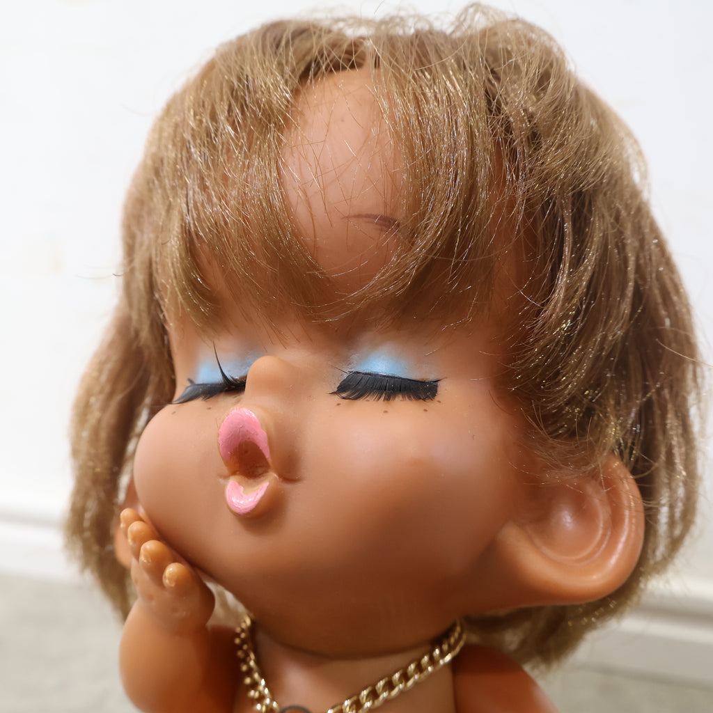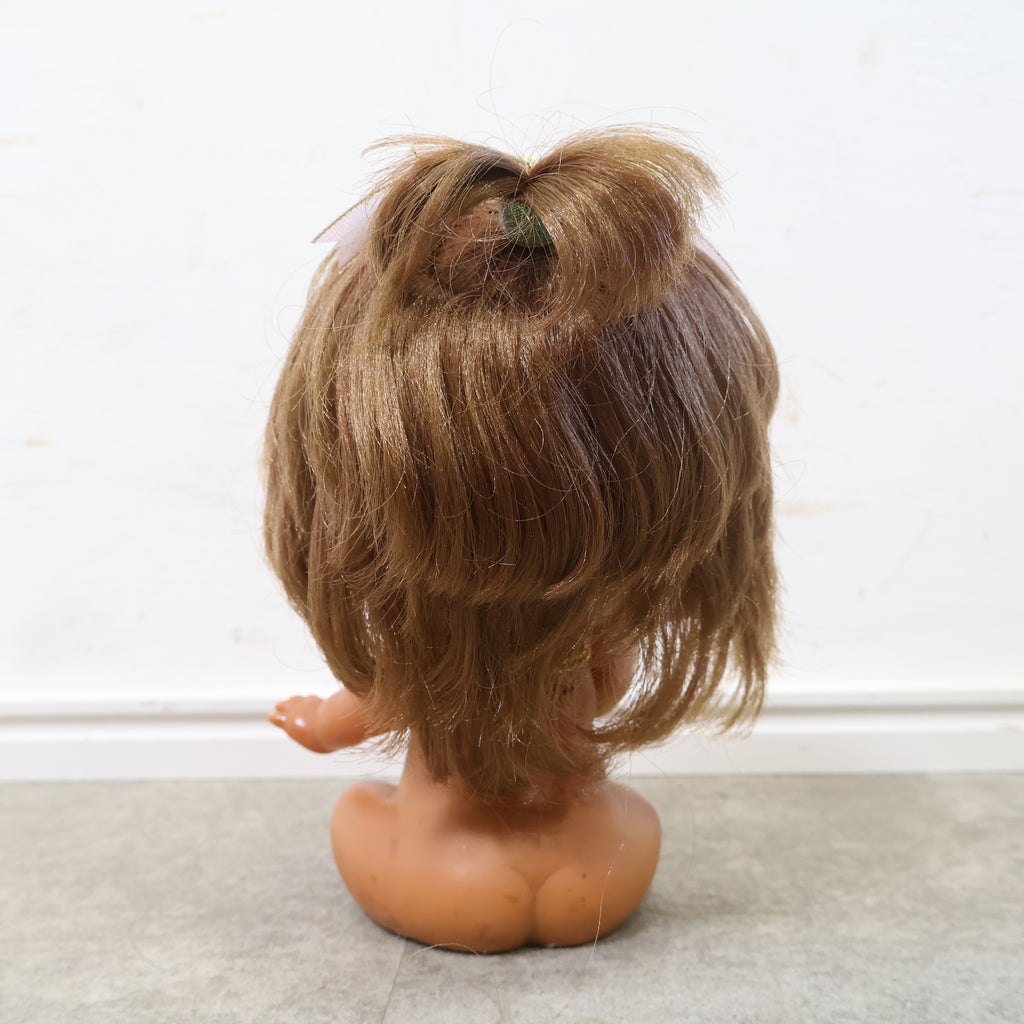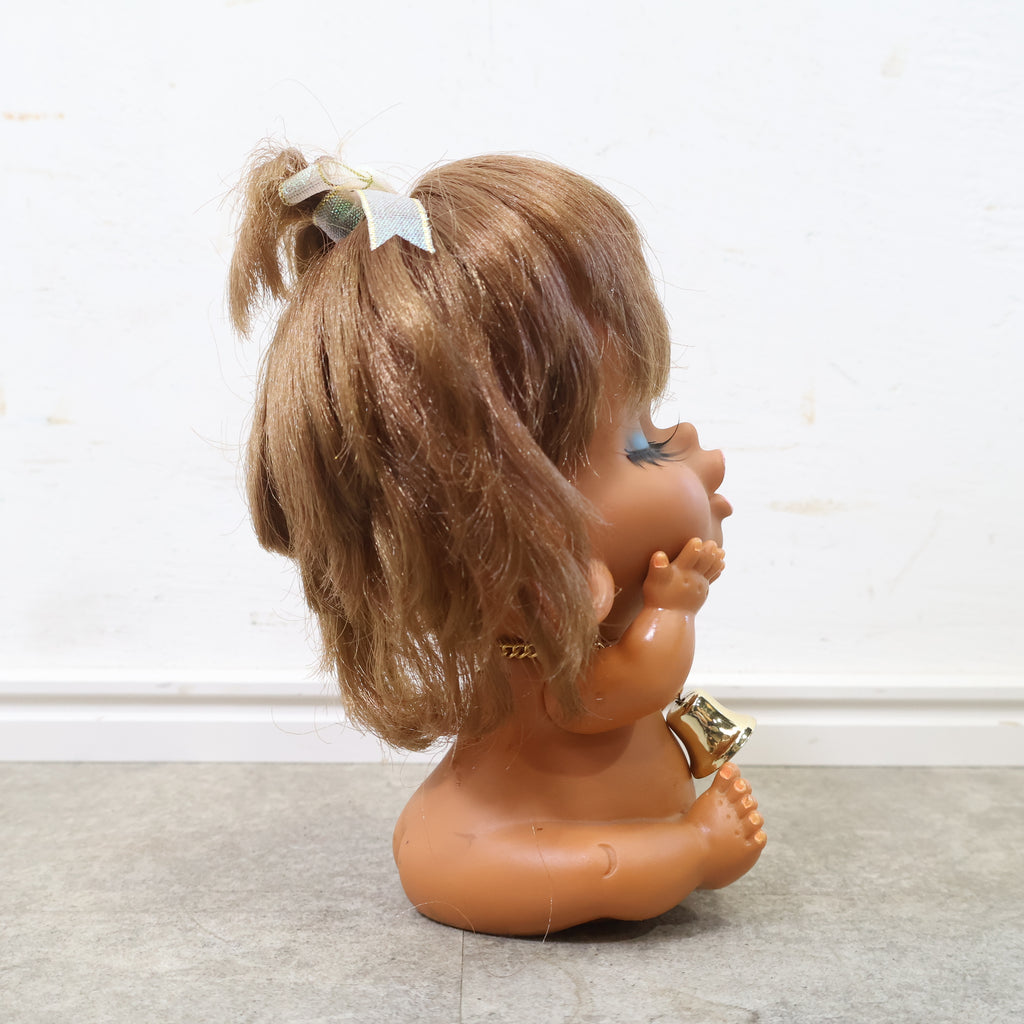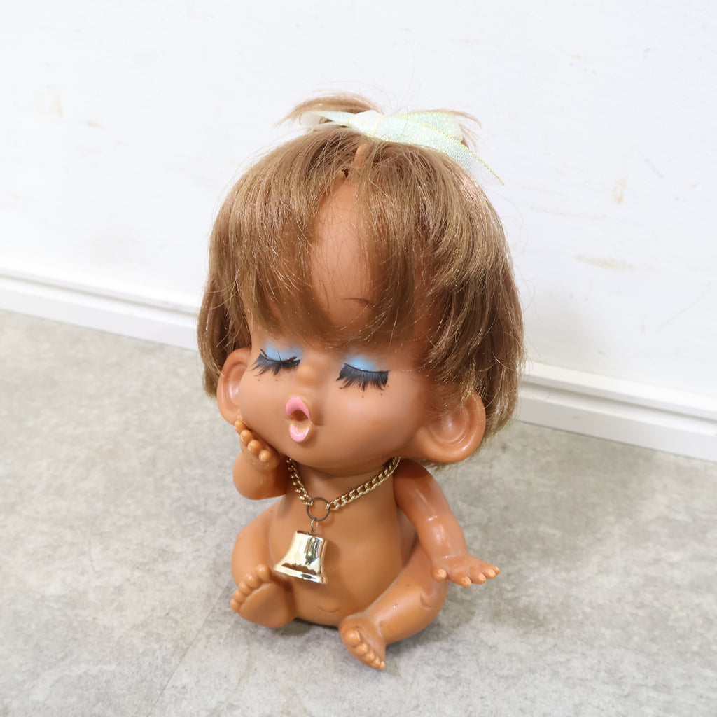 ご提供いただいた情報や特徴から、当時の人気シリーズ「モンプミ?」またはその関連のキャラクターである可能性が高いです。ぱっちりとしたブルーの瞳と、長いまつげが特徴的な**「ベンツ目」**の愛らしい表情が魅力です。髪は植毛され、首元のベルのチャームがアクセントになっています。