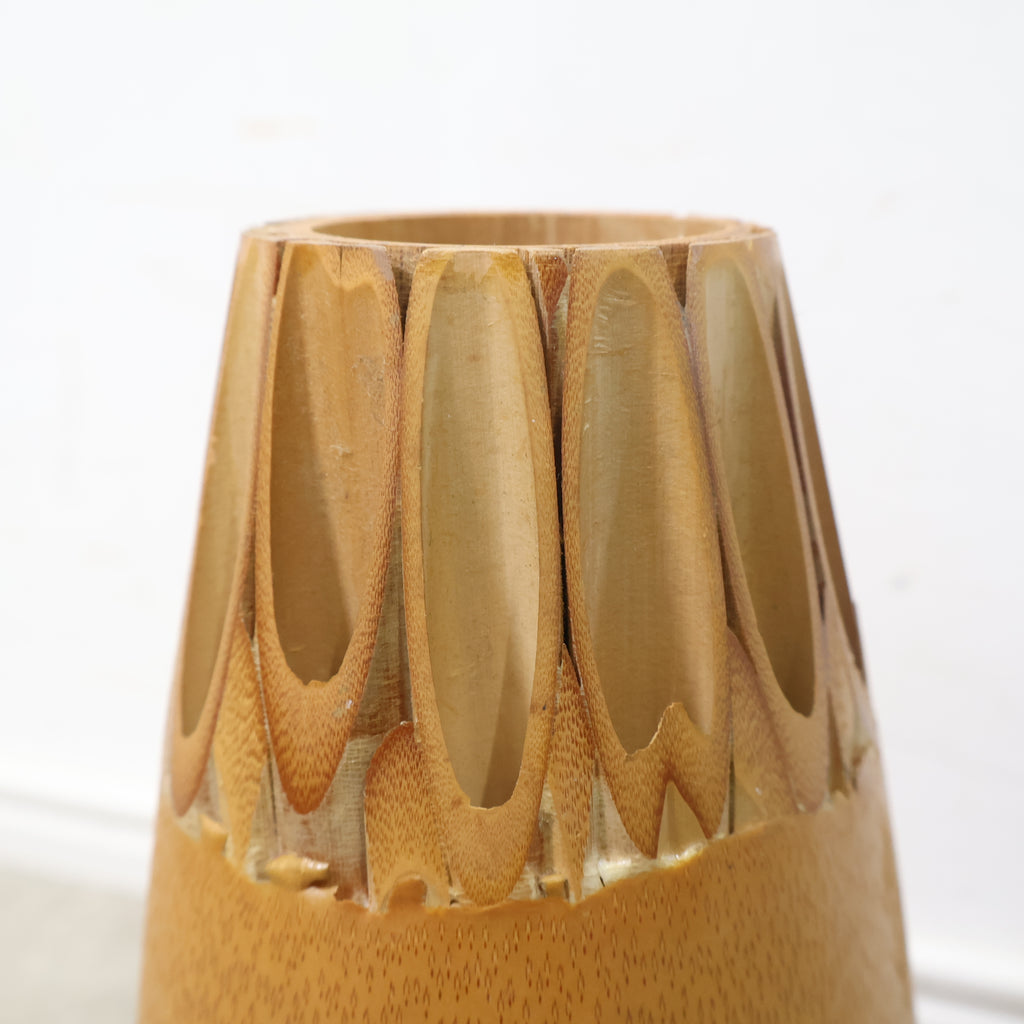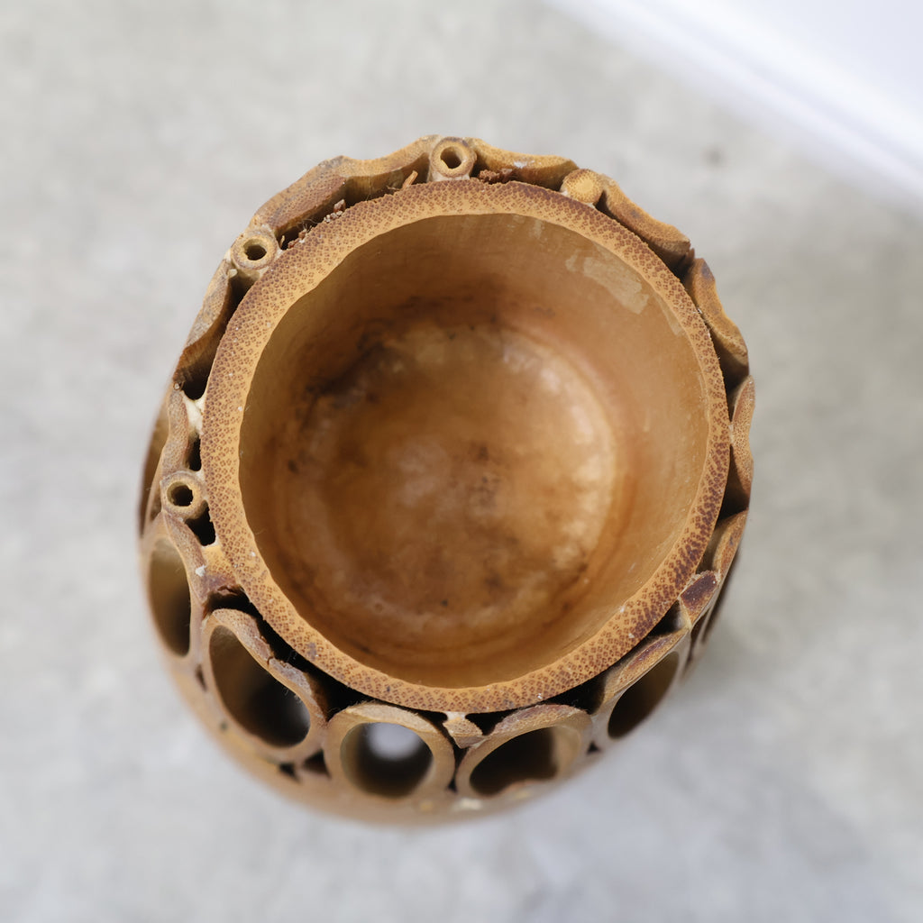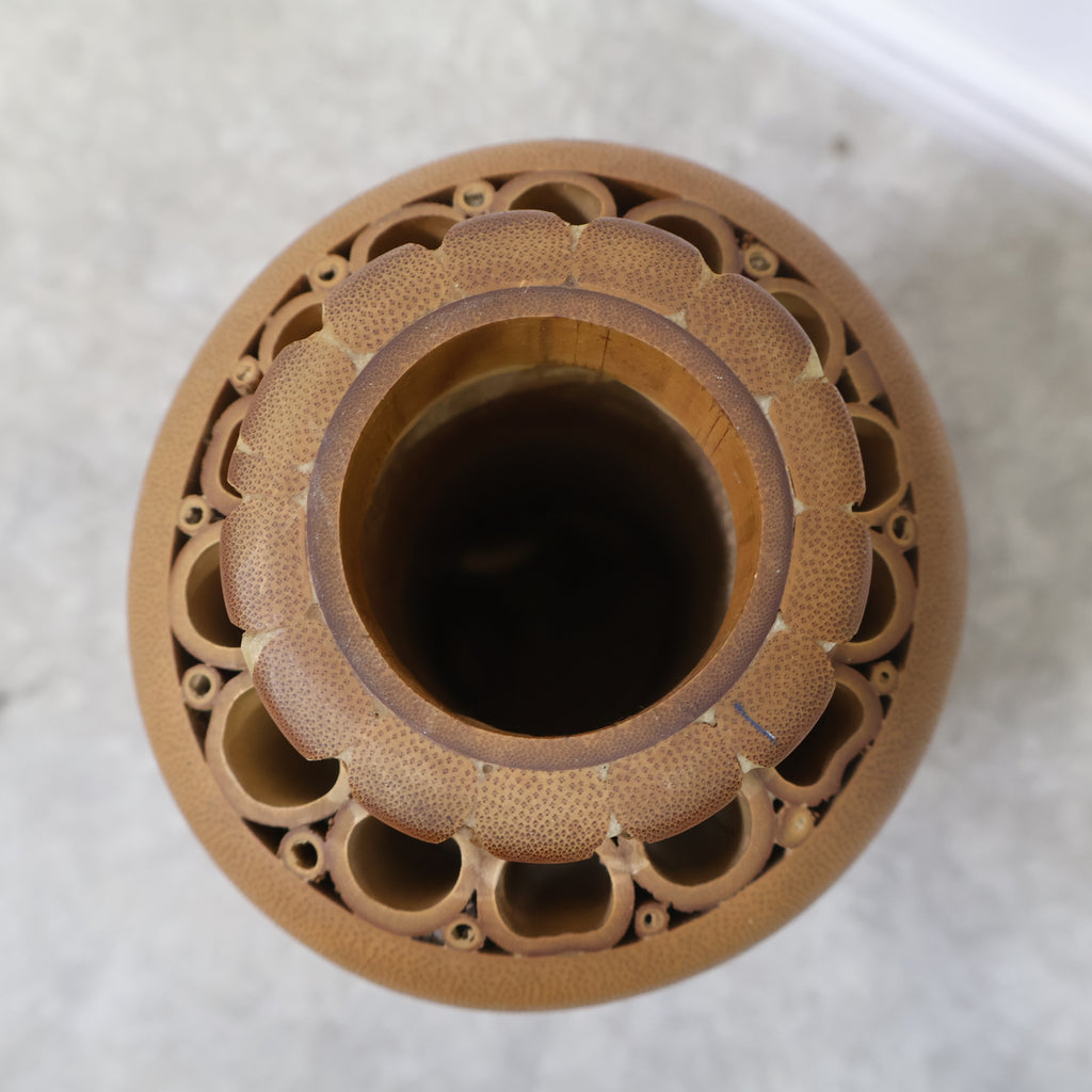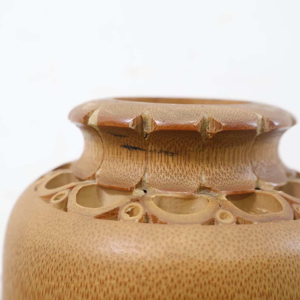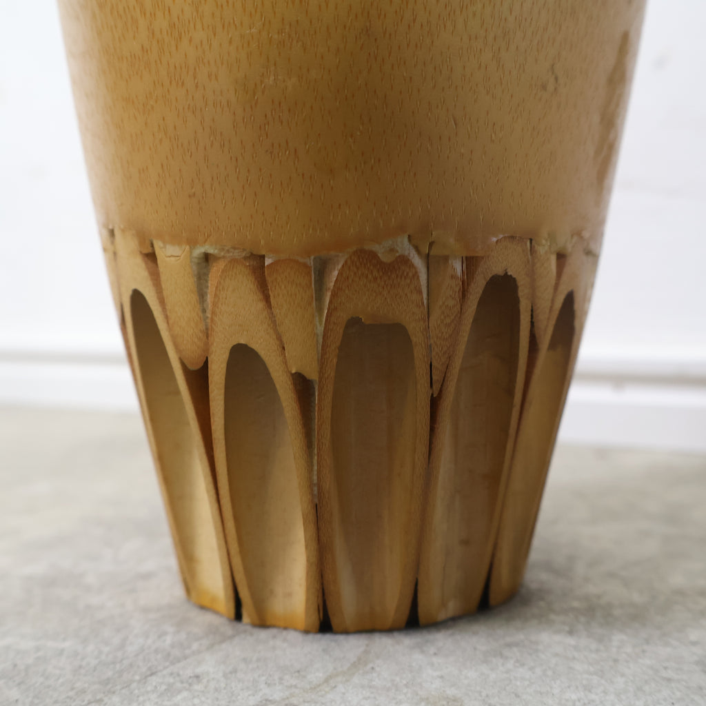 全体が天然の竹材で丁寧に作られており、竹本来の温かい色味と、きめ細やかな質感が魅力です。胴体部分は竹の節を活かした素朴な風合い、上下の縁には竹を削り出した繊細な装飾が施されています。特に底の部分は、竹の形状を活かした力強いデザインで、重厚な印象を与えます。