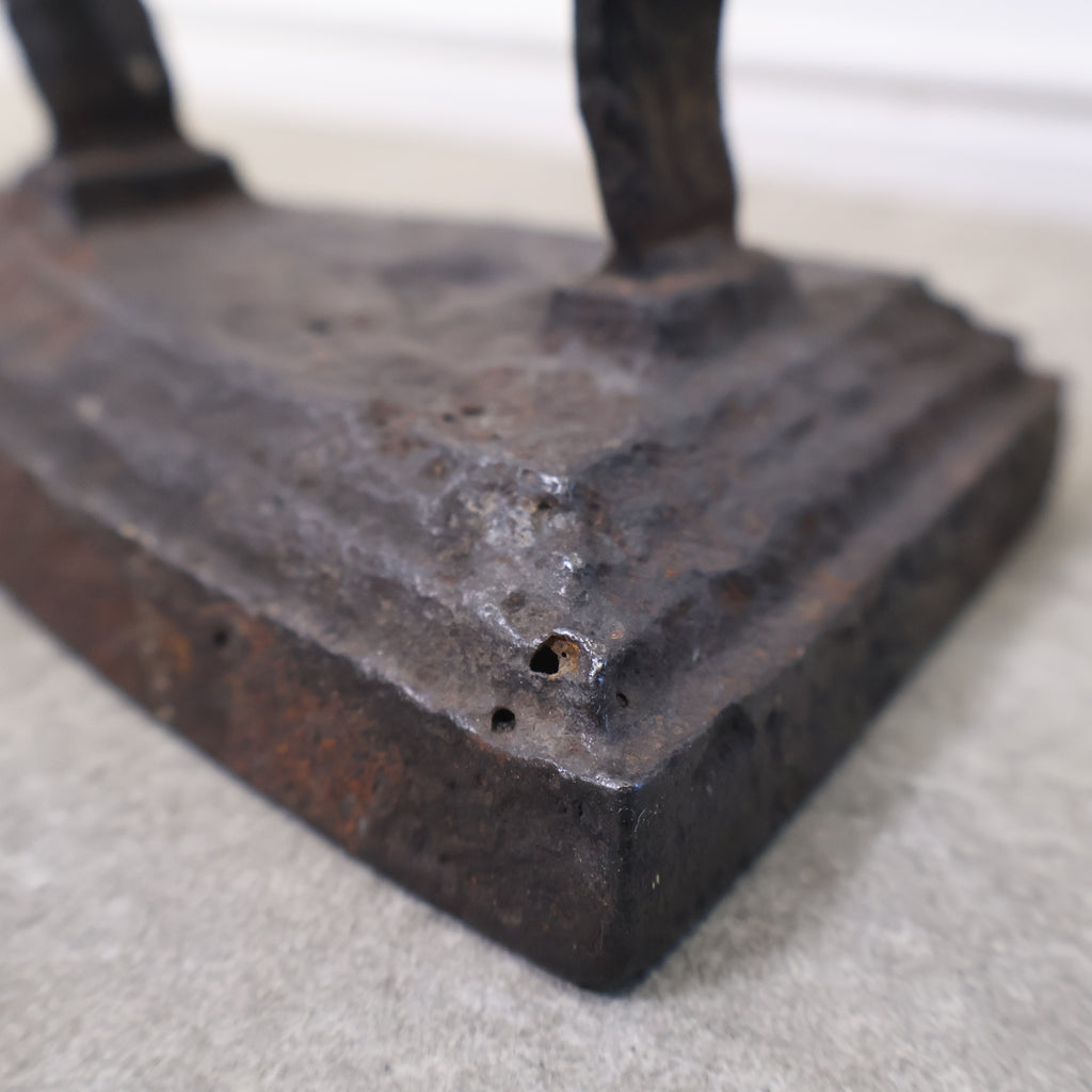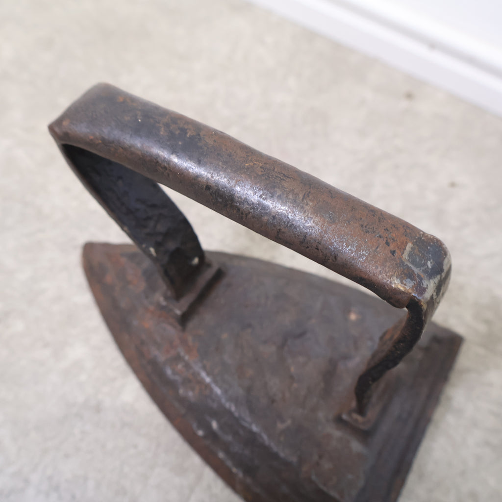これは電気がない時代に使われていた、いわゆる**「火熨斗(ひのし)」や「炭火アイロン」**の形式に近いと考えられます。武骨な鉄の質感と、長年の使用によって生まれた錆や摩耗の跡が、歴史と風格を感じさせます。