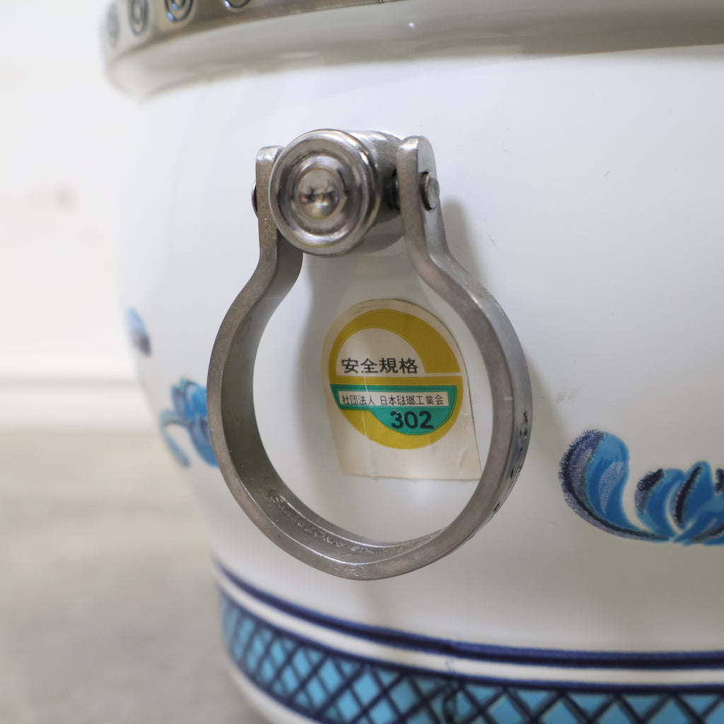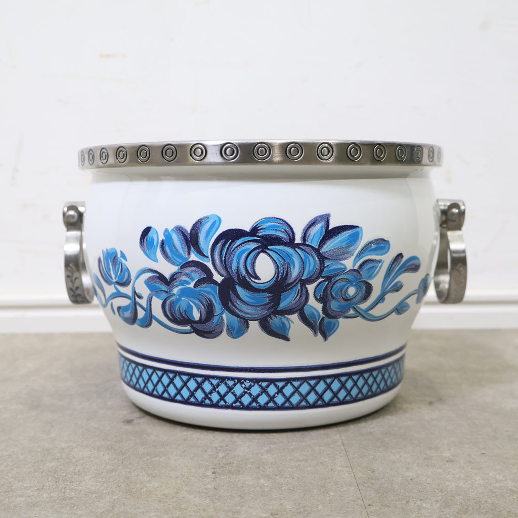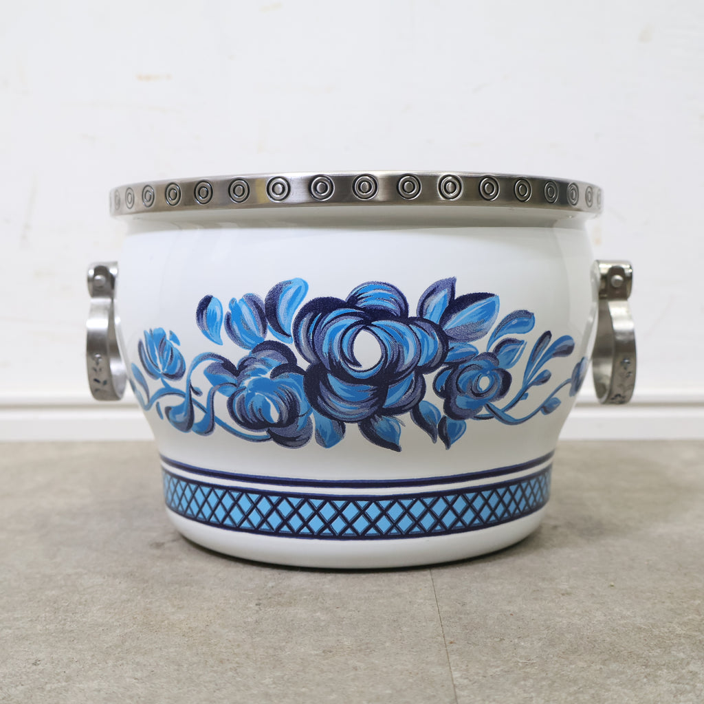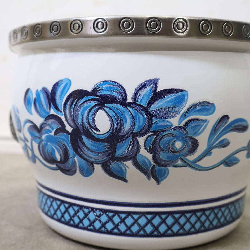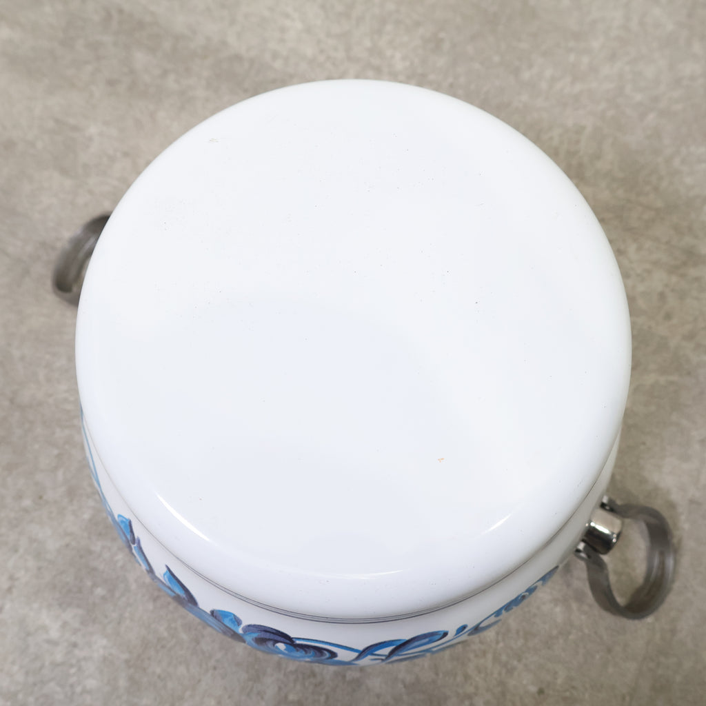 鮮やかなブルーの花柄が目を惹く、ミッチエナコペンのホーロー鍋です。