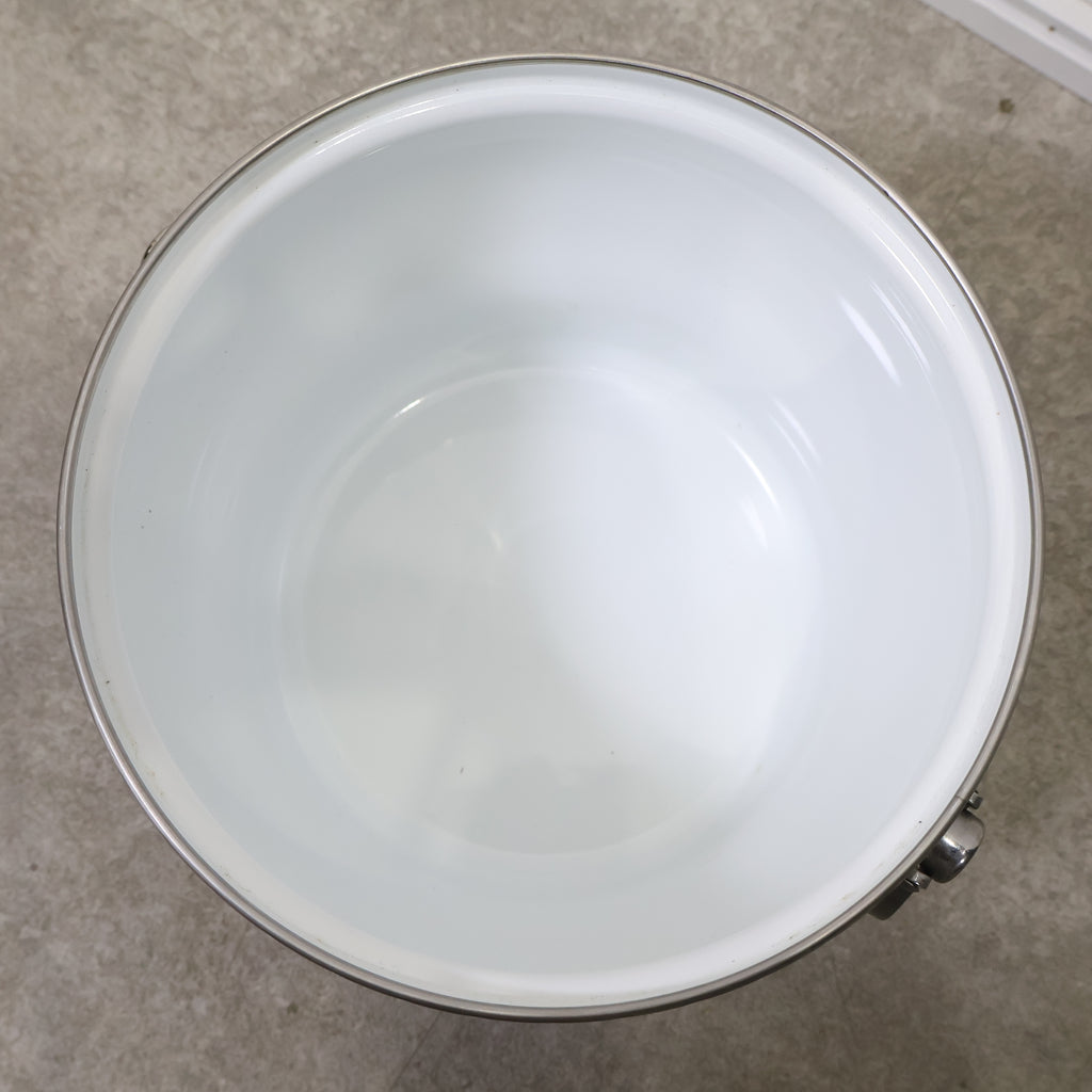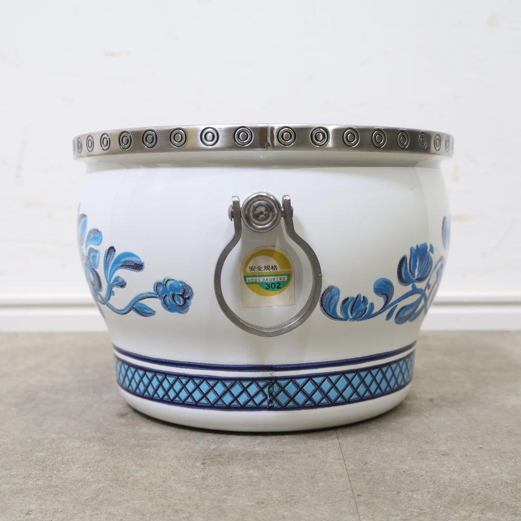 白地に美しく映える手描き風デザインが特徴で、キッチンに置くだけで北欧レトロのような温かみのある雰囲気を演出してくれます。 丸みのあるフォルムと金属製の縁・ハンドルの組み合わせが独特の存在感を放ち、実用性とデザイン性を兼ね備えた一品です。 ホーローならではの滑らかな質感と清潔感が魅力で、調理道具としてはもちろん、果物入れやキッチン雑貨として飾るだけでも絵になります。 店舗ディスプレイ・カフェの什器・撮影小物などにも使いやすく、インテリアとしても高い人気を誇ります。