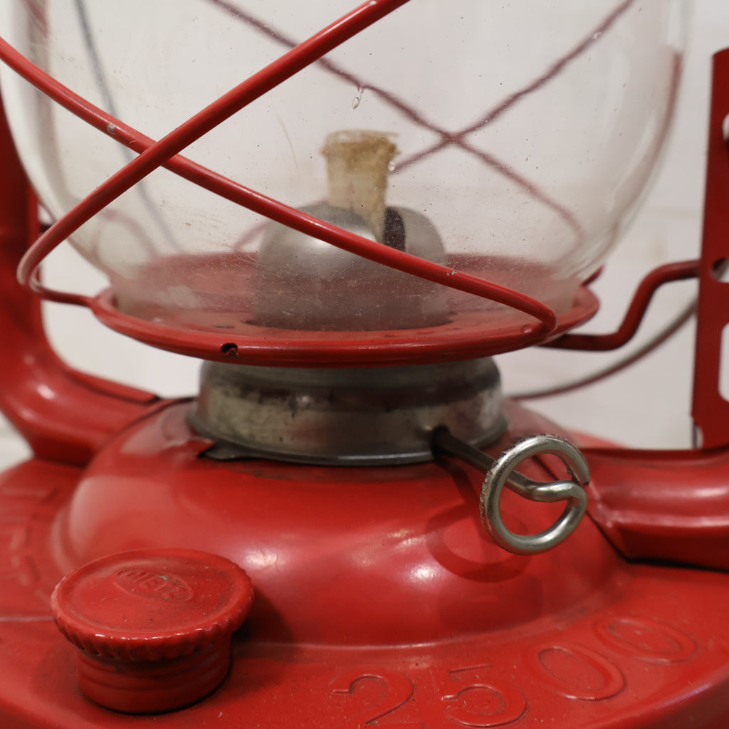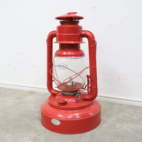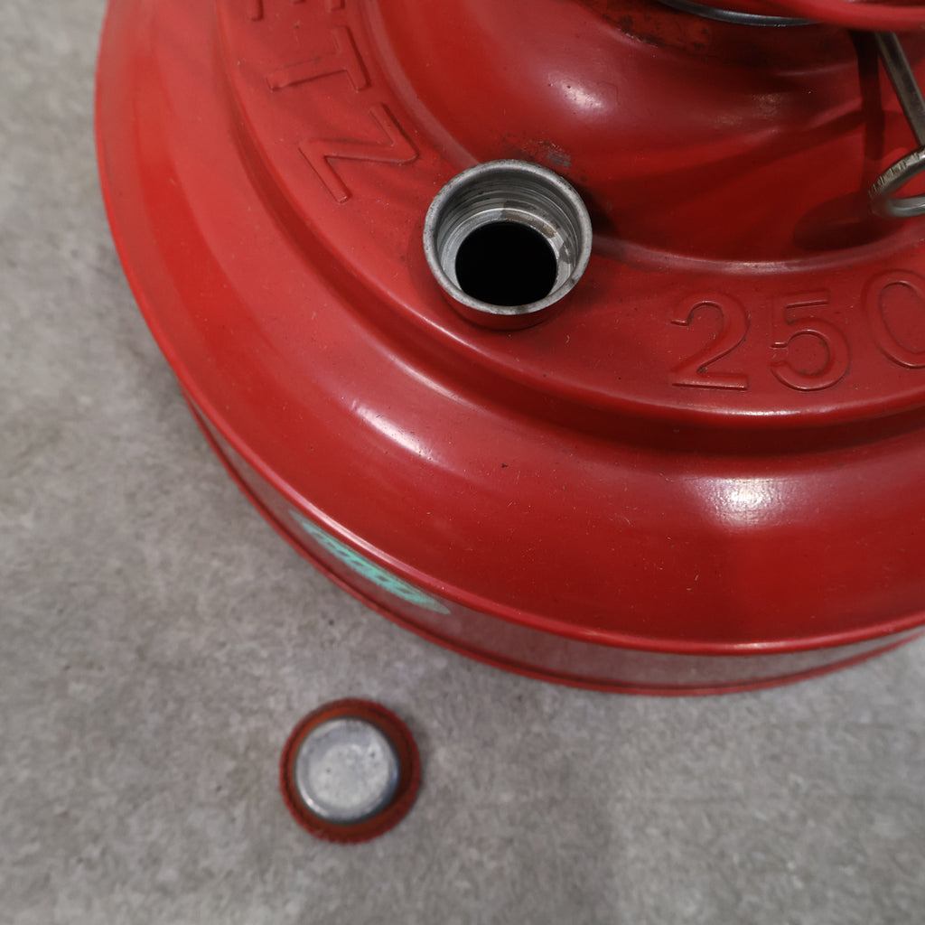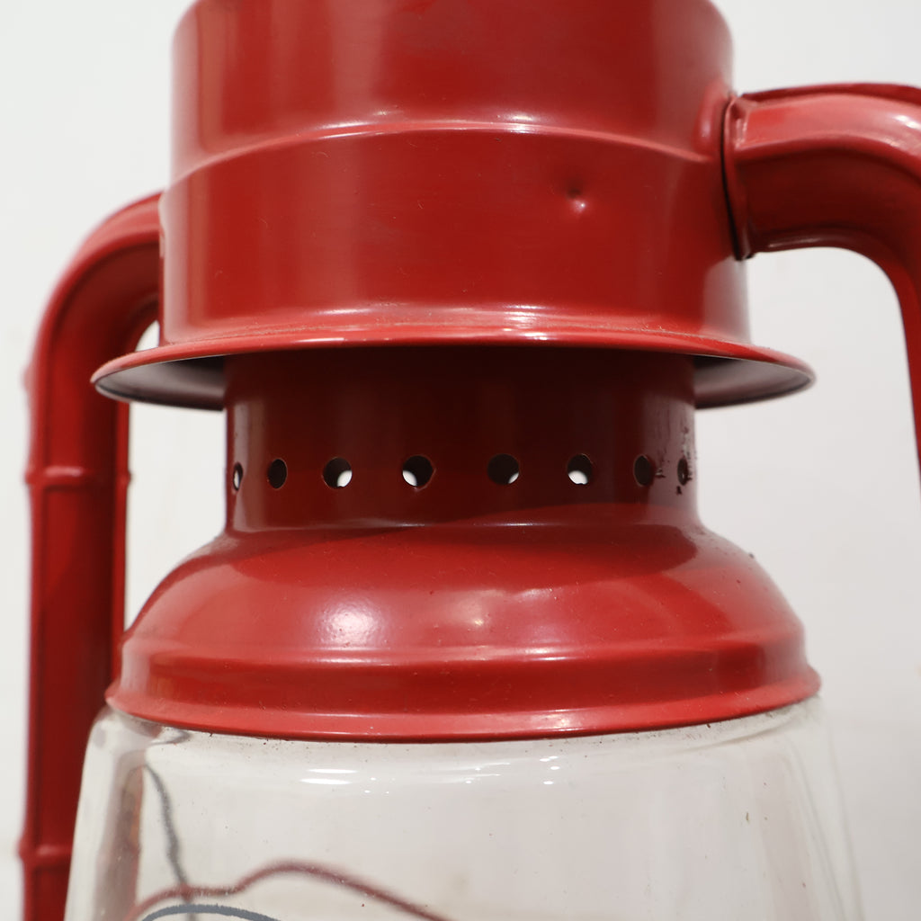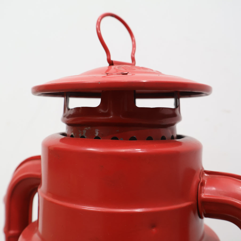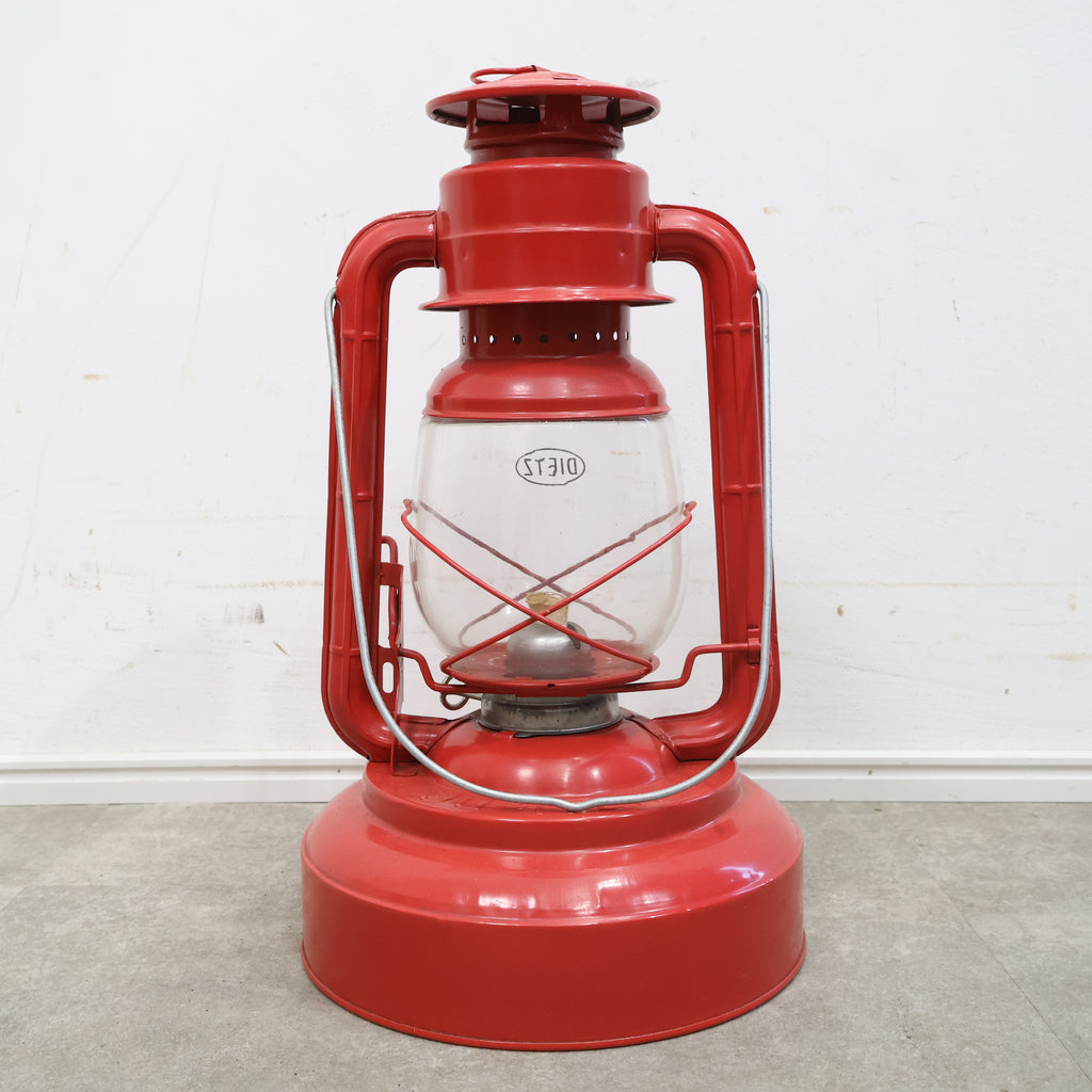 クラシックなハリケーン型のフォルムに、存在感のあるレッドカラーが印象的な一品。一般的なランタンよりもタンクが大きく、キャンプやアウトドアシーンはもちろん、ガレージや店舗什器、インダストリアルな空間のディスプレイとしても映えるサイズ感です。