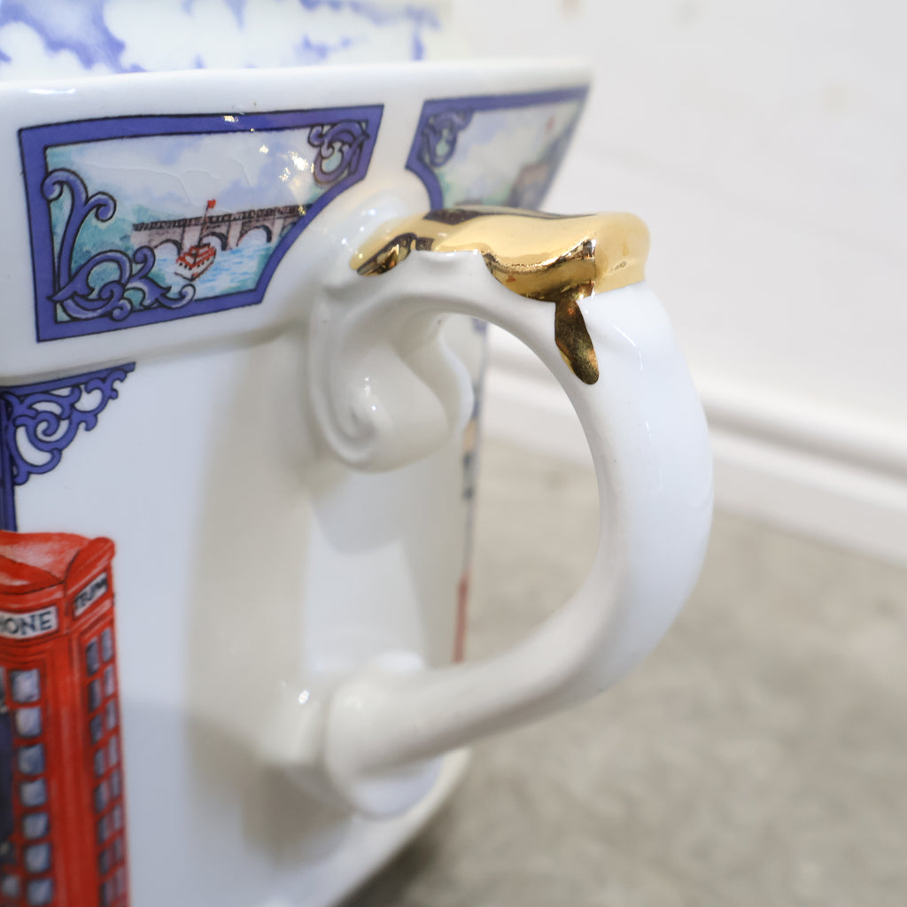 赤いダブルデッカーや電話ボックス、衛兵の姿など、イギリスらしいアイコンが細やかなタッチで描かれ、眺めているだけでも楽しい一品。ぽってりとしたフォルムと存在感のあるデザインは、ティータイムはもちろん、キャビネットや棚に飾るディスプレイアイテムとしてもおすすめです。