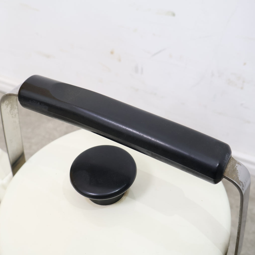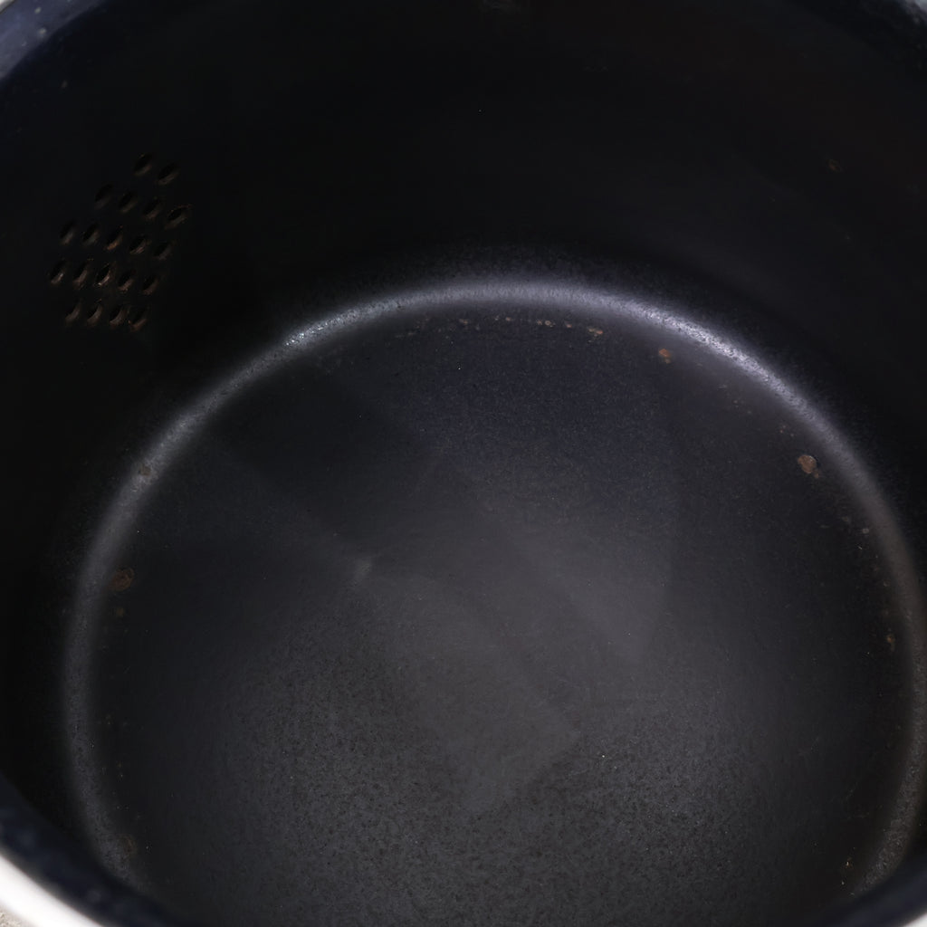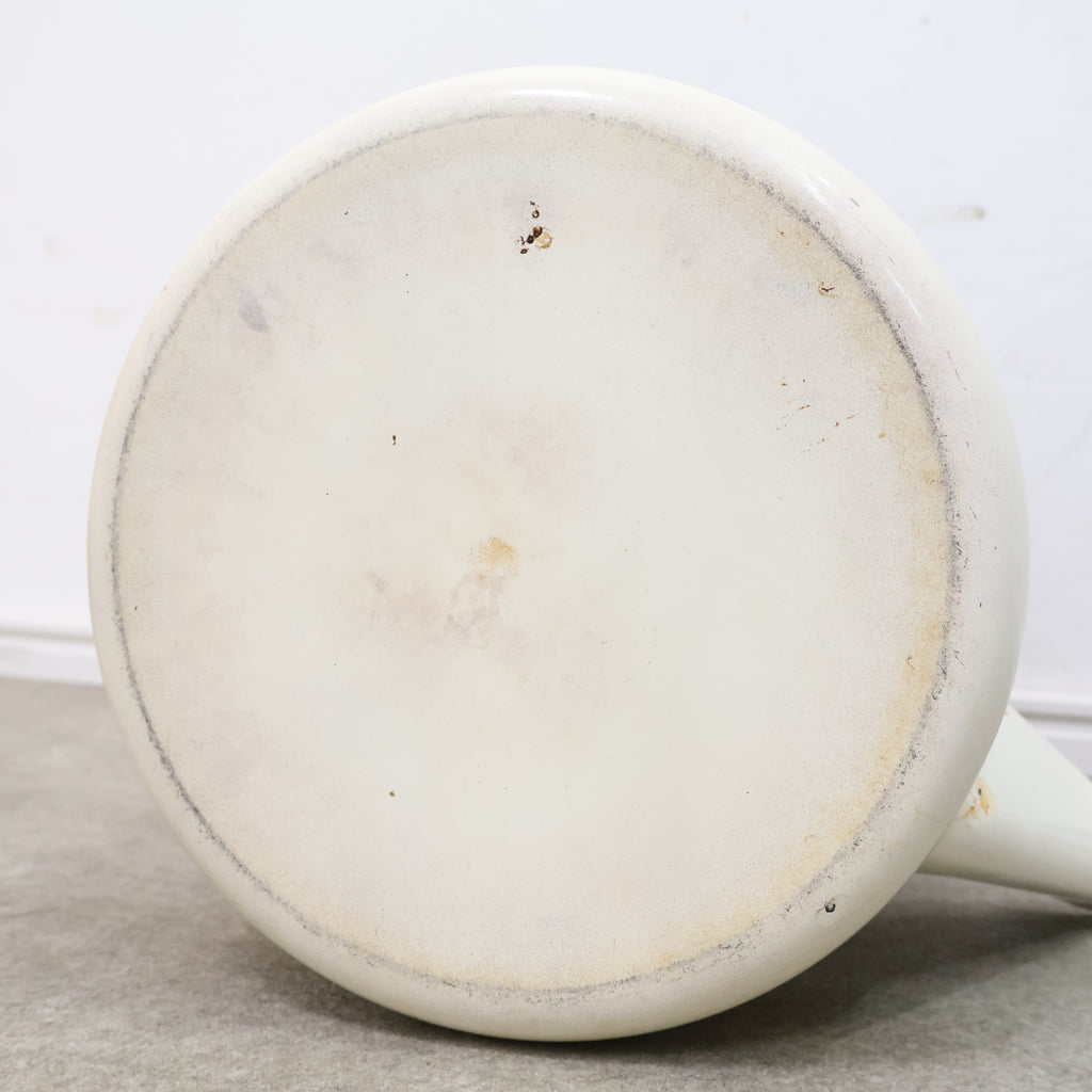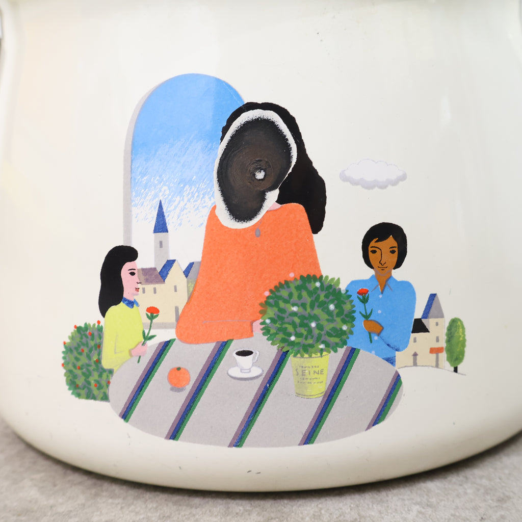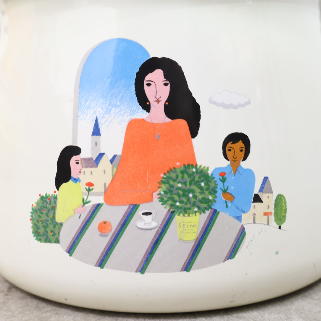 やさしいアイボリーカラーの本体に、食卓を囲む人物が描かれた可愛らしいデザイン。どこか昭和の雰囲気を感じさせる温かみのある絵柄が魅力です。 ホーローならではの清潔感のある質感と、シンプルで扱いやすいフォルムもポイント。キッチンでの実用はもちろん、インテリアとして飾っても楽しいアイテムです。 レトロキッチン雑貨や昭和レトロがお好きな方にもおすすめ