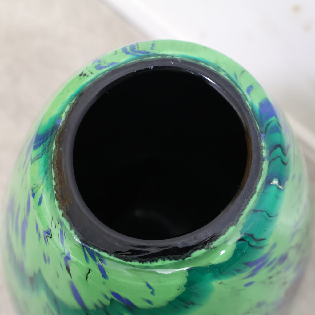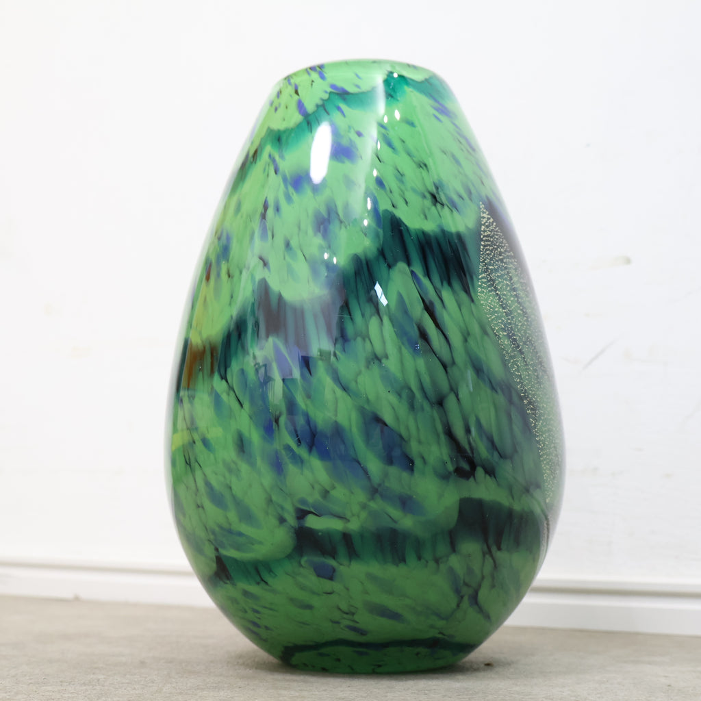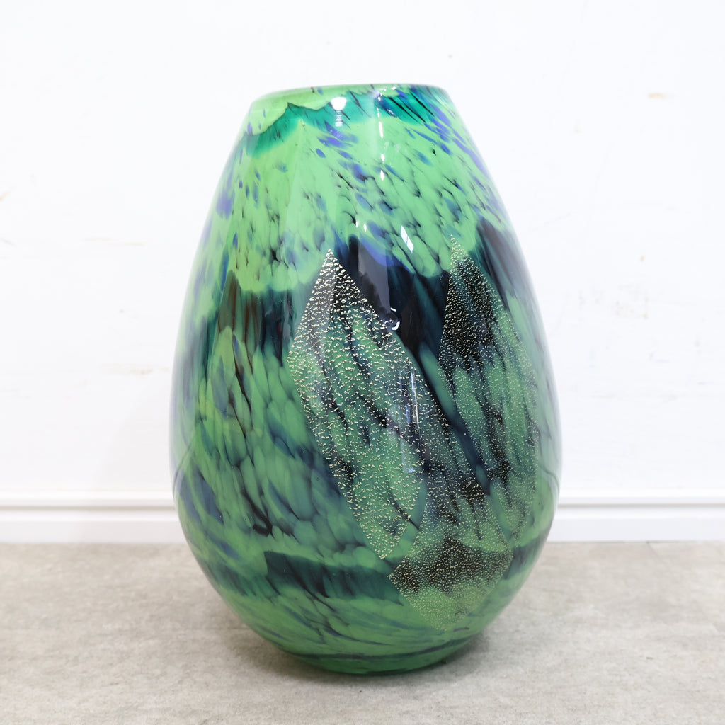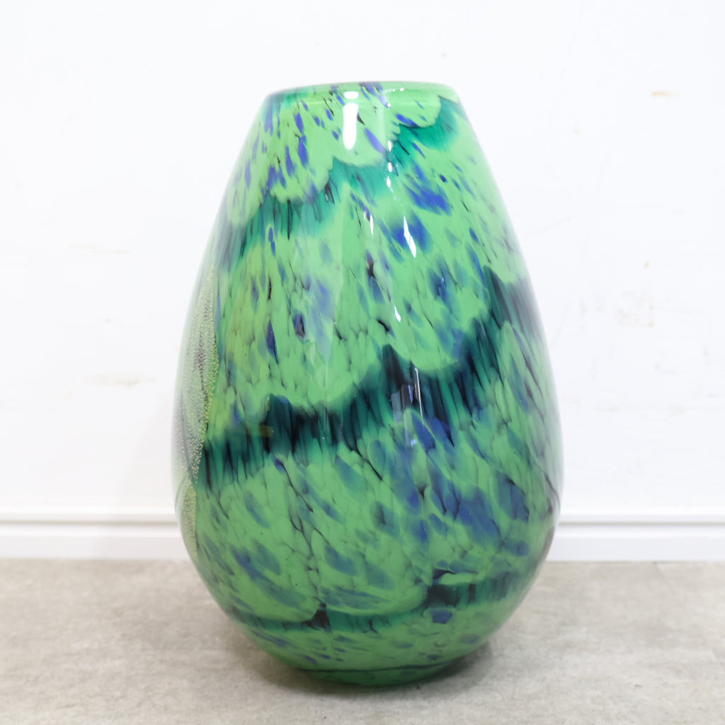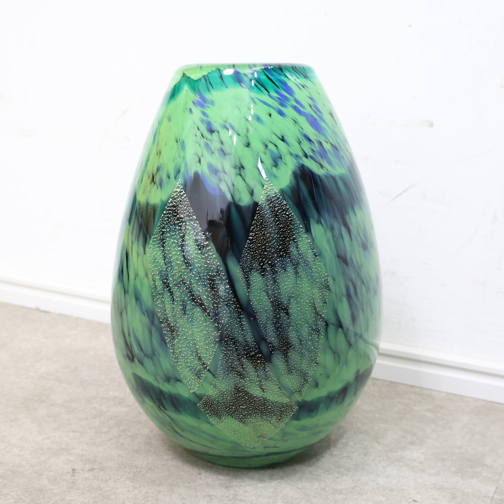 濃淡のあるグリーンやブルーが溶け合うような模様に、金彩の粒子が散りばめられた幻想的なデザインが特徴。光の当たり方によって表情が変わり、ガラス工芸ならではの美しさを楽しめます。 丸みのあるフォルムで安定感もあり、花を活けるフラワーベースとしてはもちろん、インテリアオブジェとして飾るのもおすすめ。存在感のあるデザインで、お部屋のアクセントにもぴったりです。